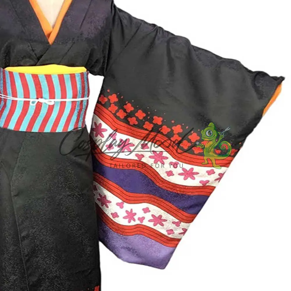 Un lungo kimono prevalentemente nero con inserti arancioni ed ampie maniche decorate, finiture floreali di colore rosso e una fascia in vita a righe. Questa nelle immagini è la versione broccato, il costume è disponibile anche in versione classica.