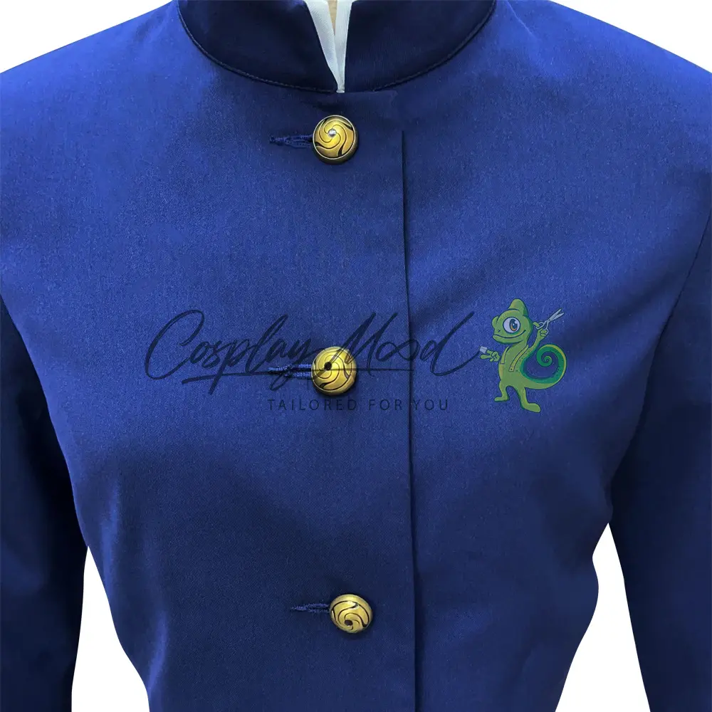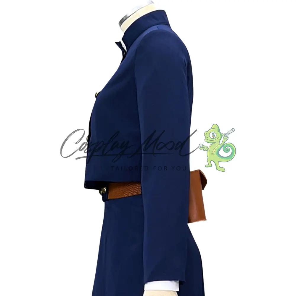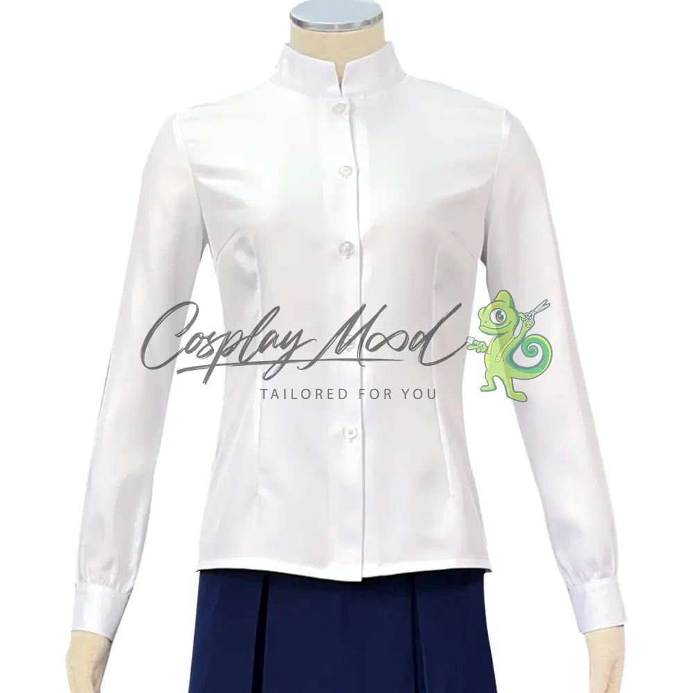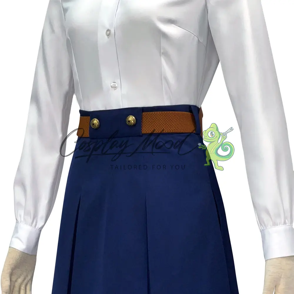Giacca blu con bottoni e colletto alto, camicetta bianca, gonna blu, calze nere e cintura marrone con borsello.