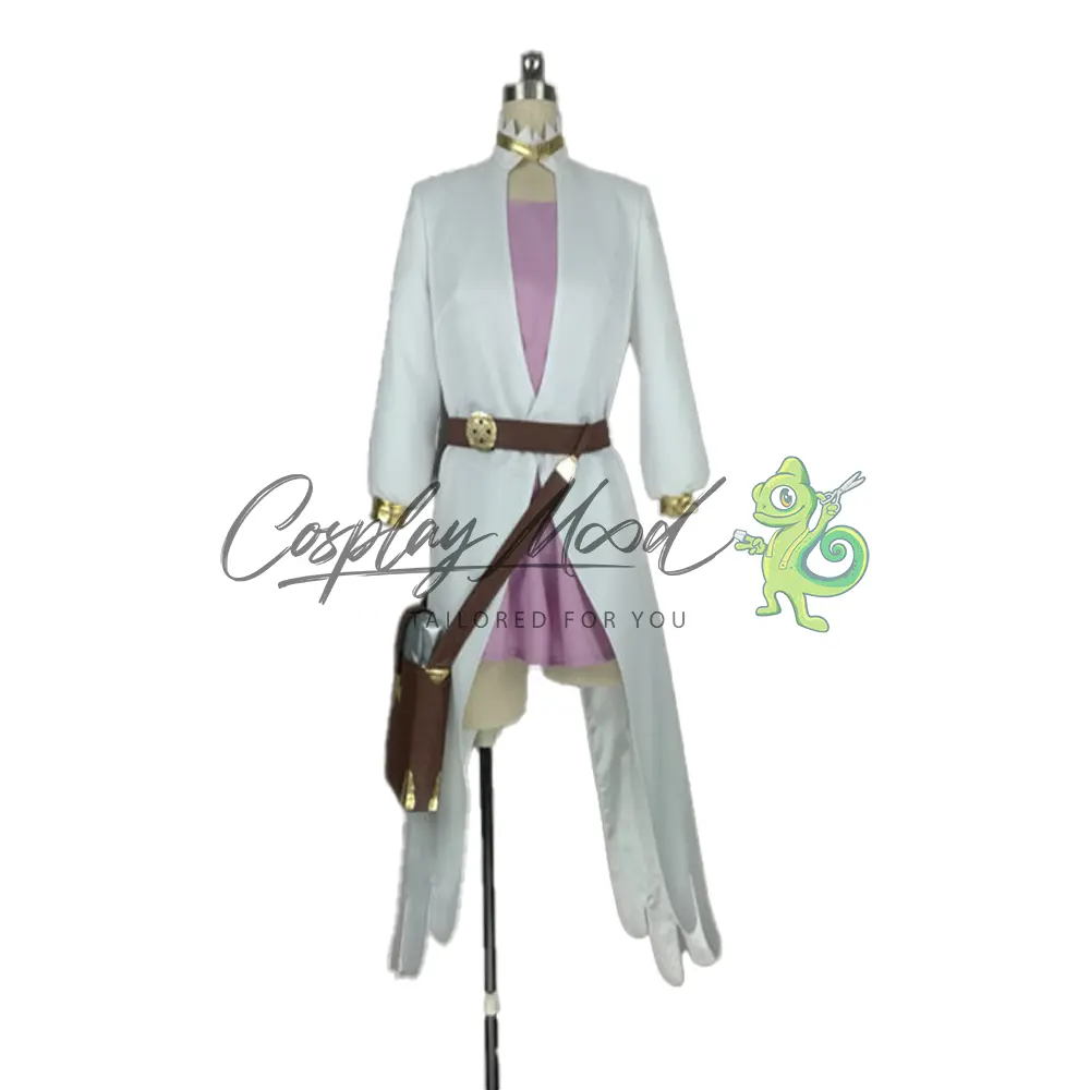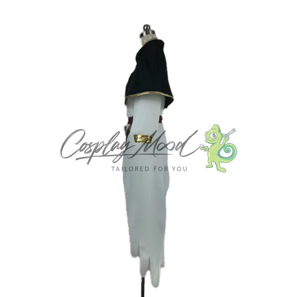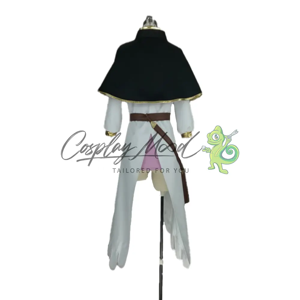 Mantellina nera con bordi dorati e logo, vestito bianco lungo con maniche e colletto dorato, cintura marrone e porta grimorio per il fianco, vestito rosa e gambali bianchi con bordo dorato.