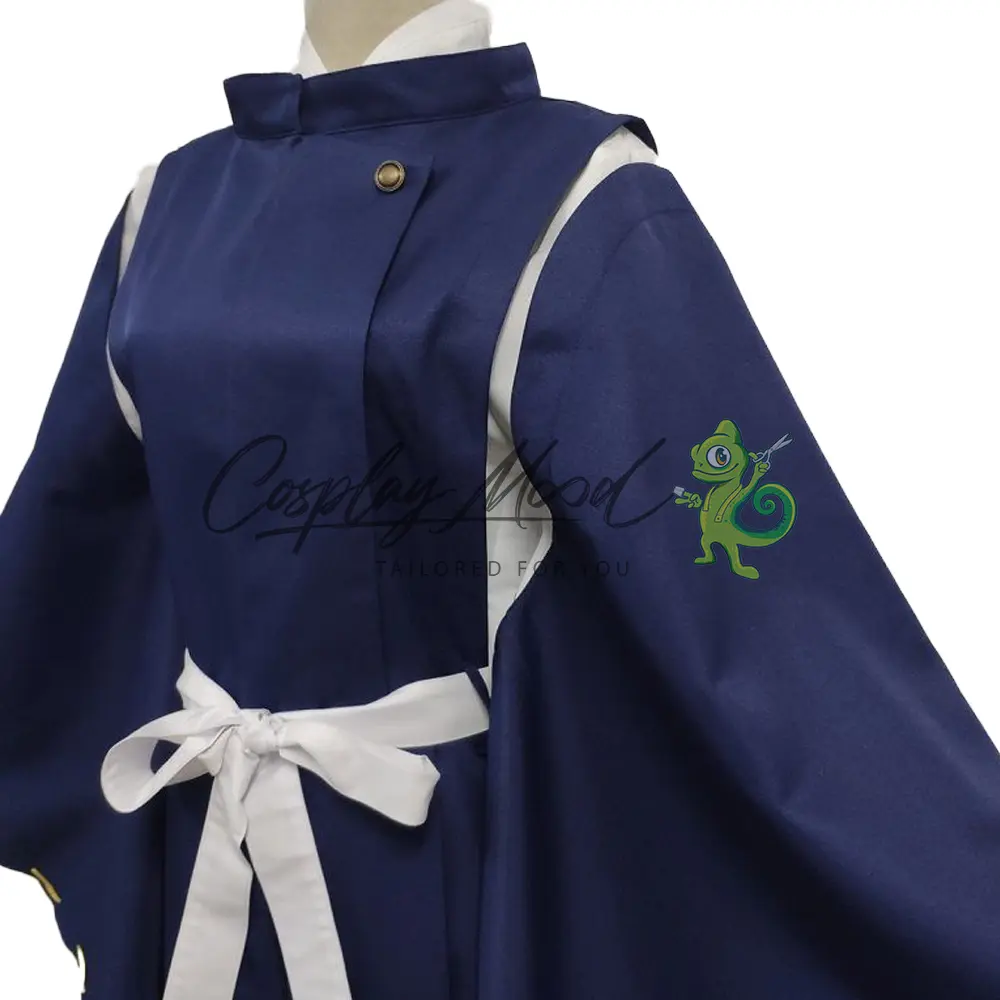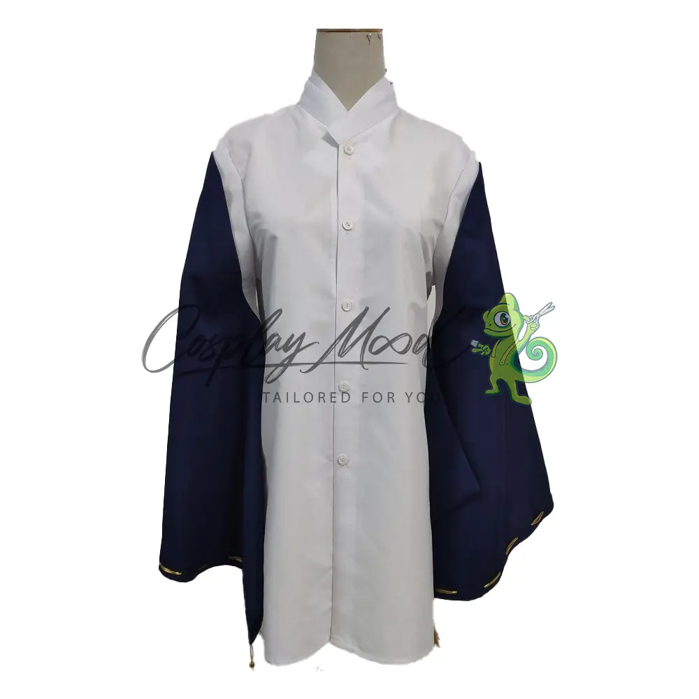 Kimono blu con bottone e decorazioni dorate, nappette alle maniche, veste interna bianca, cintura bianca in vita, pantaloni lunghi blu.