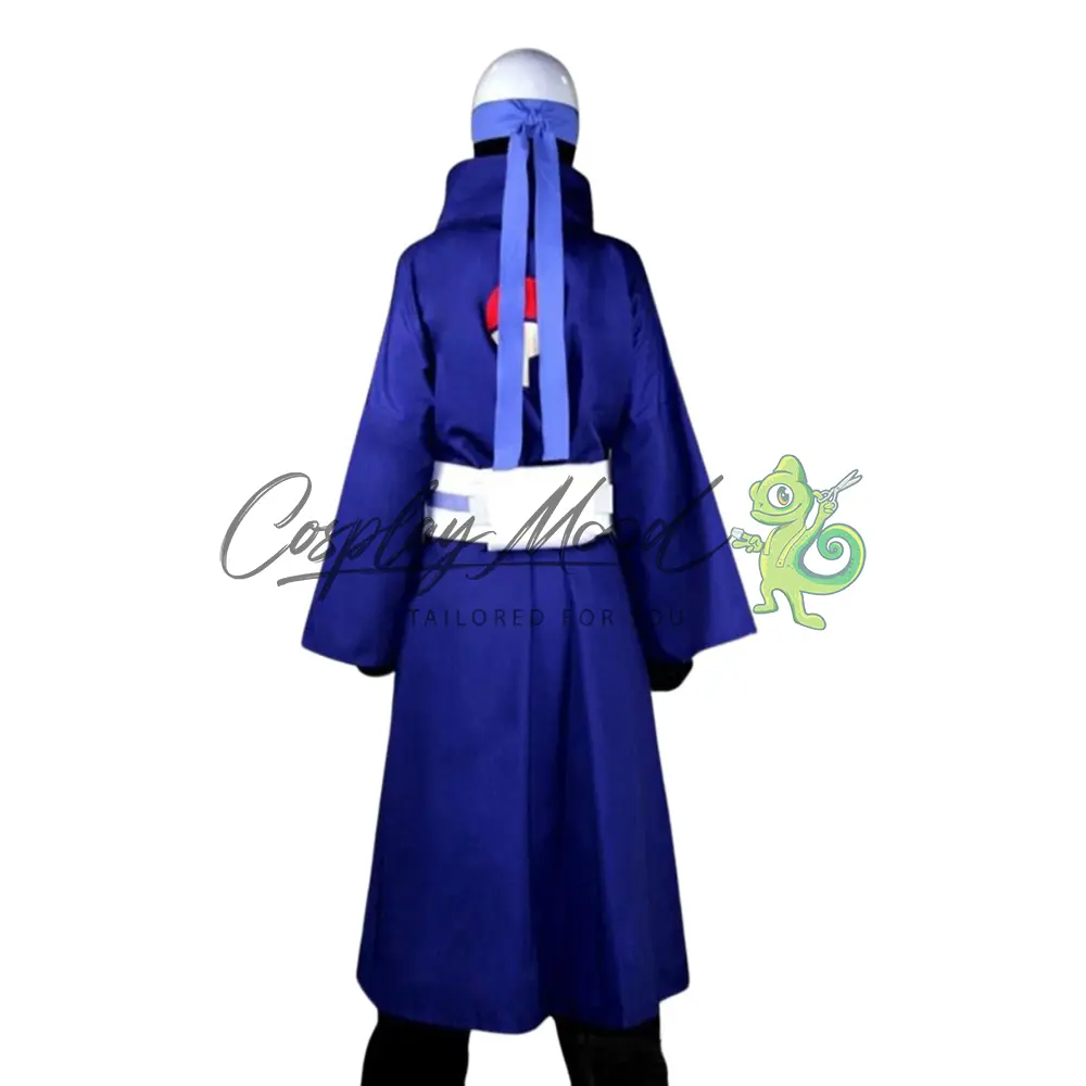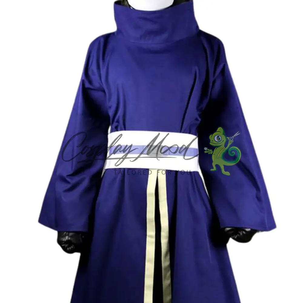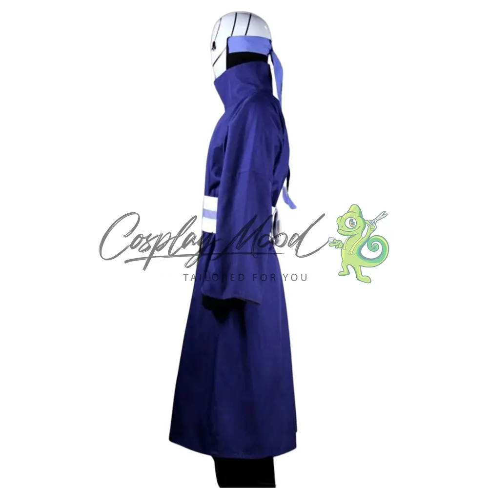 Tunica lunga color viola con collo alto e stampa del clan Uchiha sulla schiena, fascia bianca ed azzurra, pantaloni lunghi neri con polsini, maglia nera e guanti dello stesso colore. La maschera è venduta separatamente.
