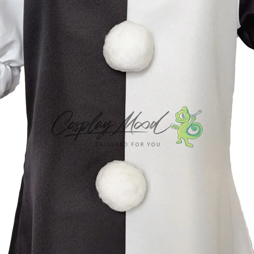 Abito bianco e nero a maniche corte con pon pon frontali, calze abbinate.