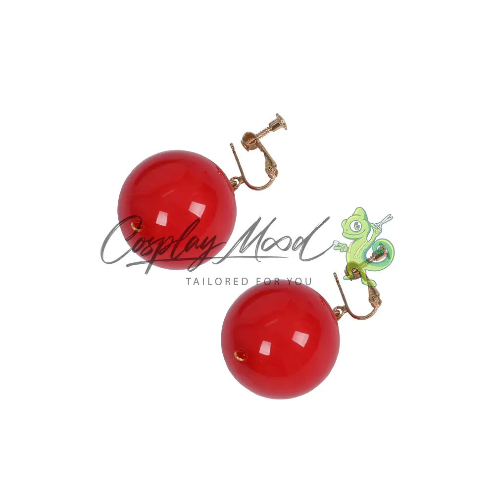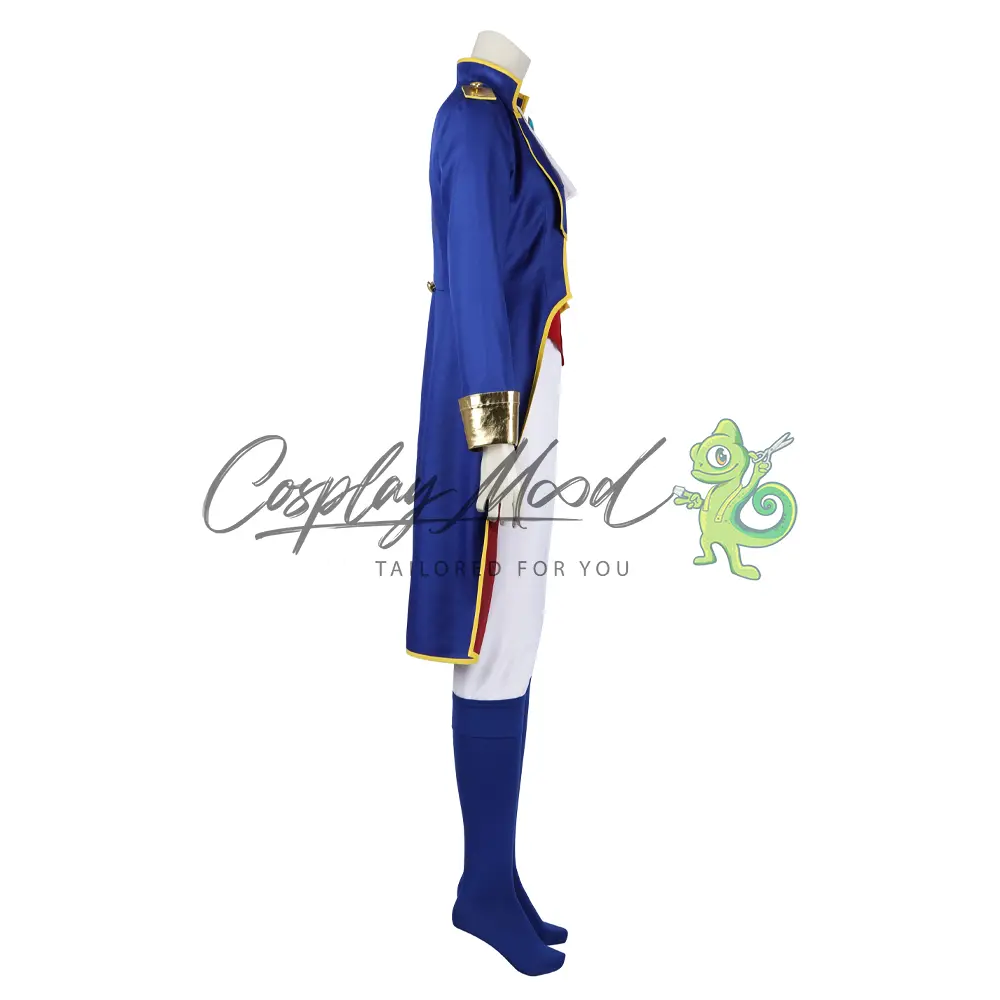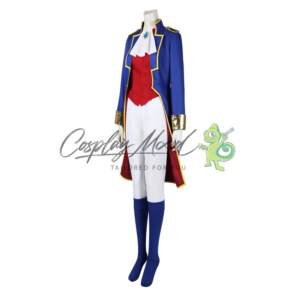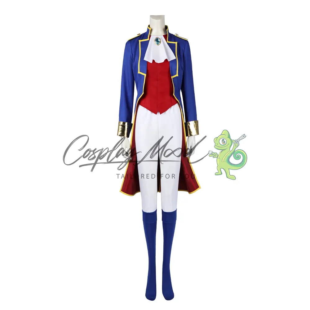 Cappello blu con piuma da moschettiere e rosa, gilet rosso, pantaloni bianchi e giacca lunga blu foderata internamente di tessuto rosso, fazzoletto bianco con pietra e orecchini rossi.