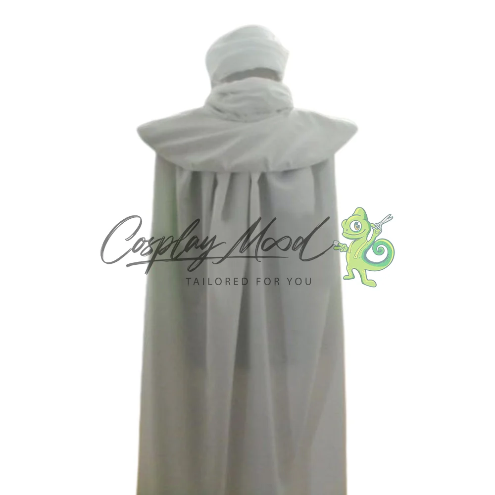 Mantello lungo bianco con spalline imbottite, turbante, maglia con decorazioni e polsini integrati, pantaloni, fascia da mettere in vita color azzurro.