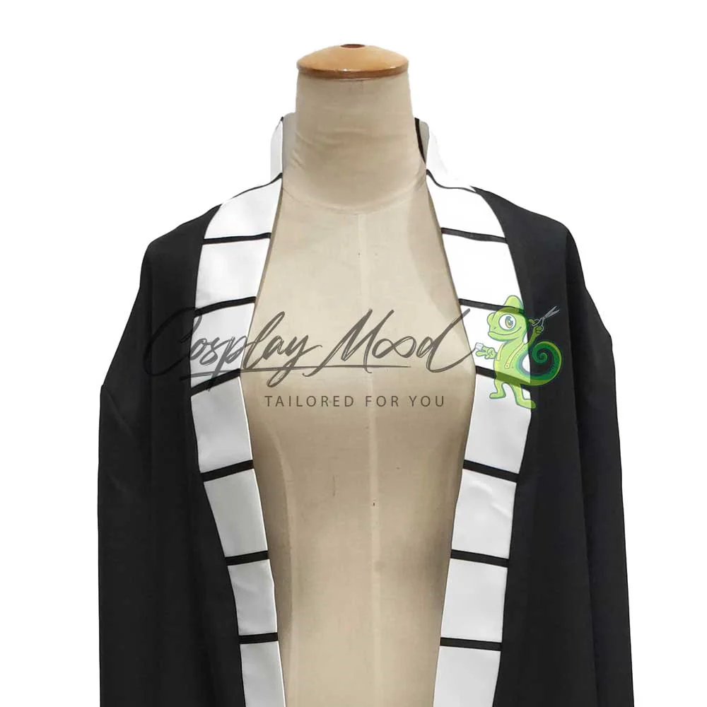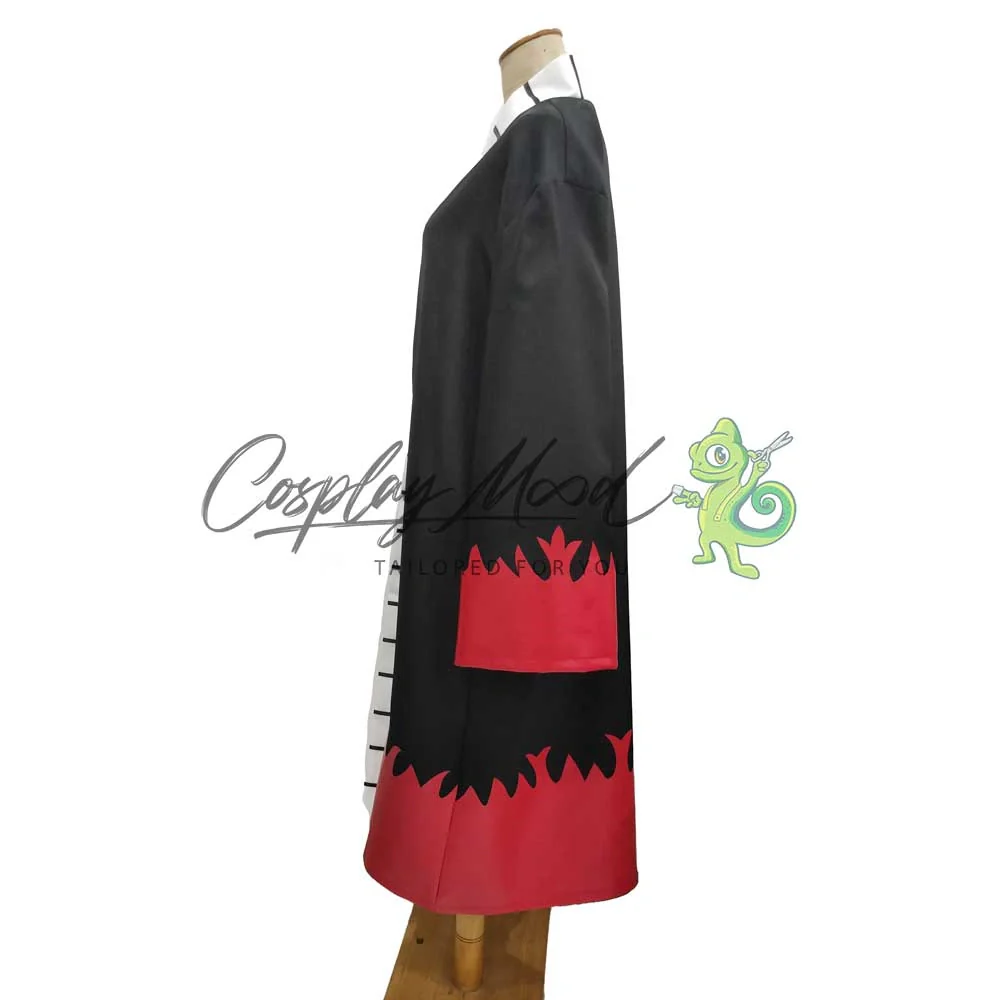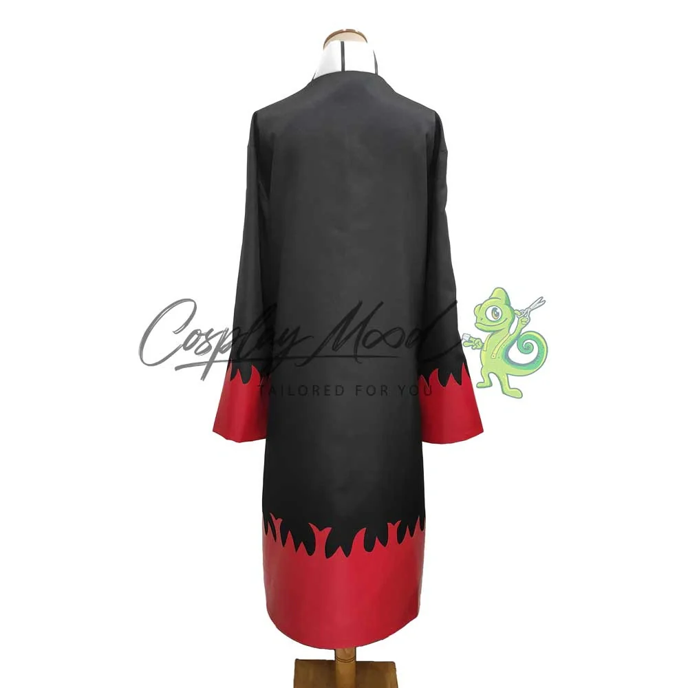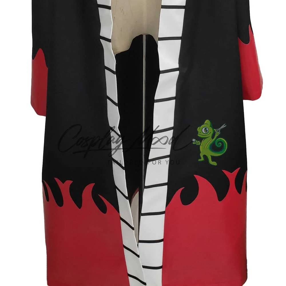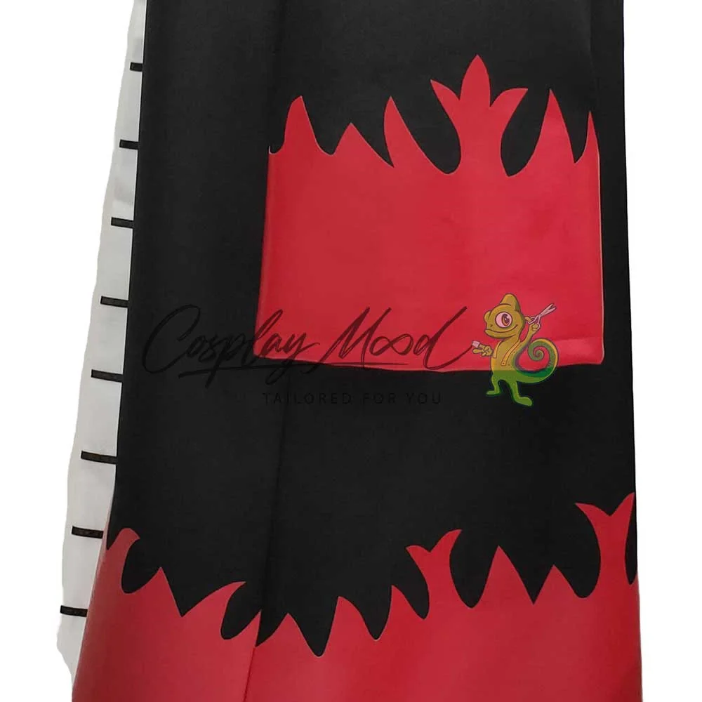 Un lungo abito nero con motivi rossi che richiamano le fiamme ed una banda bianca e nera al margine della veste.