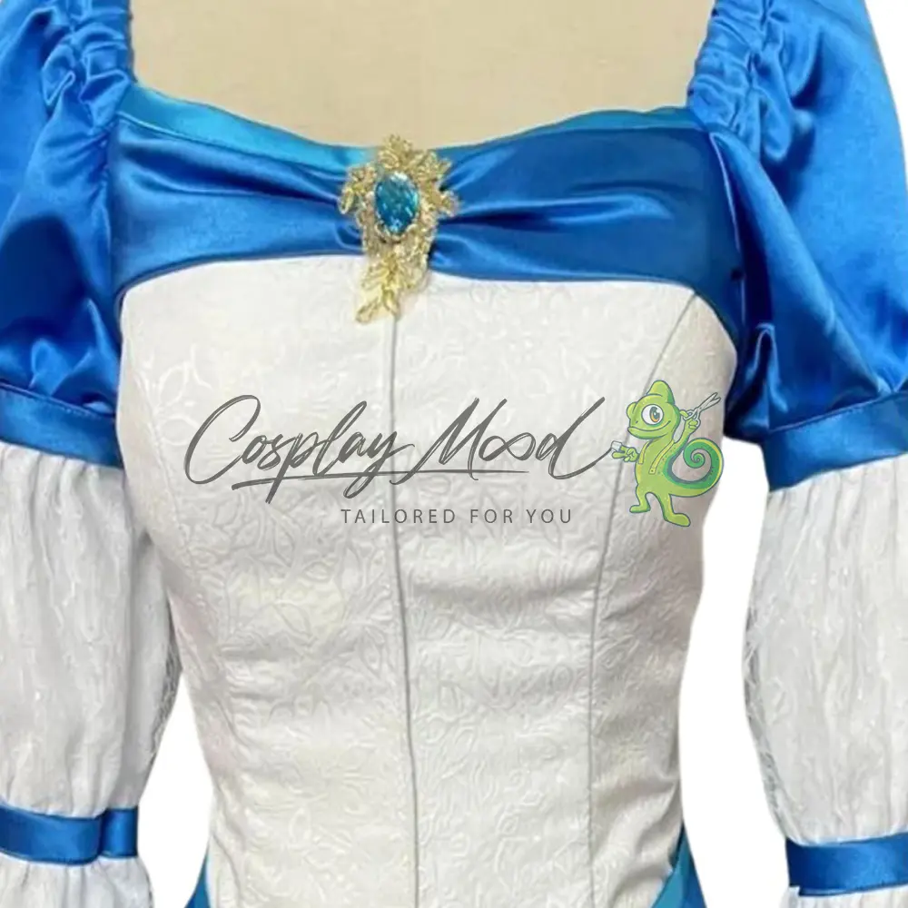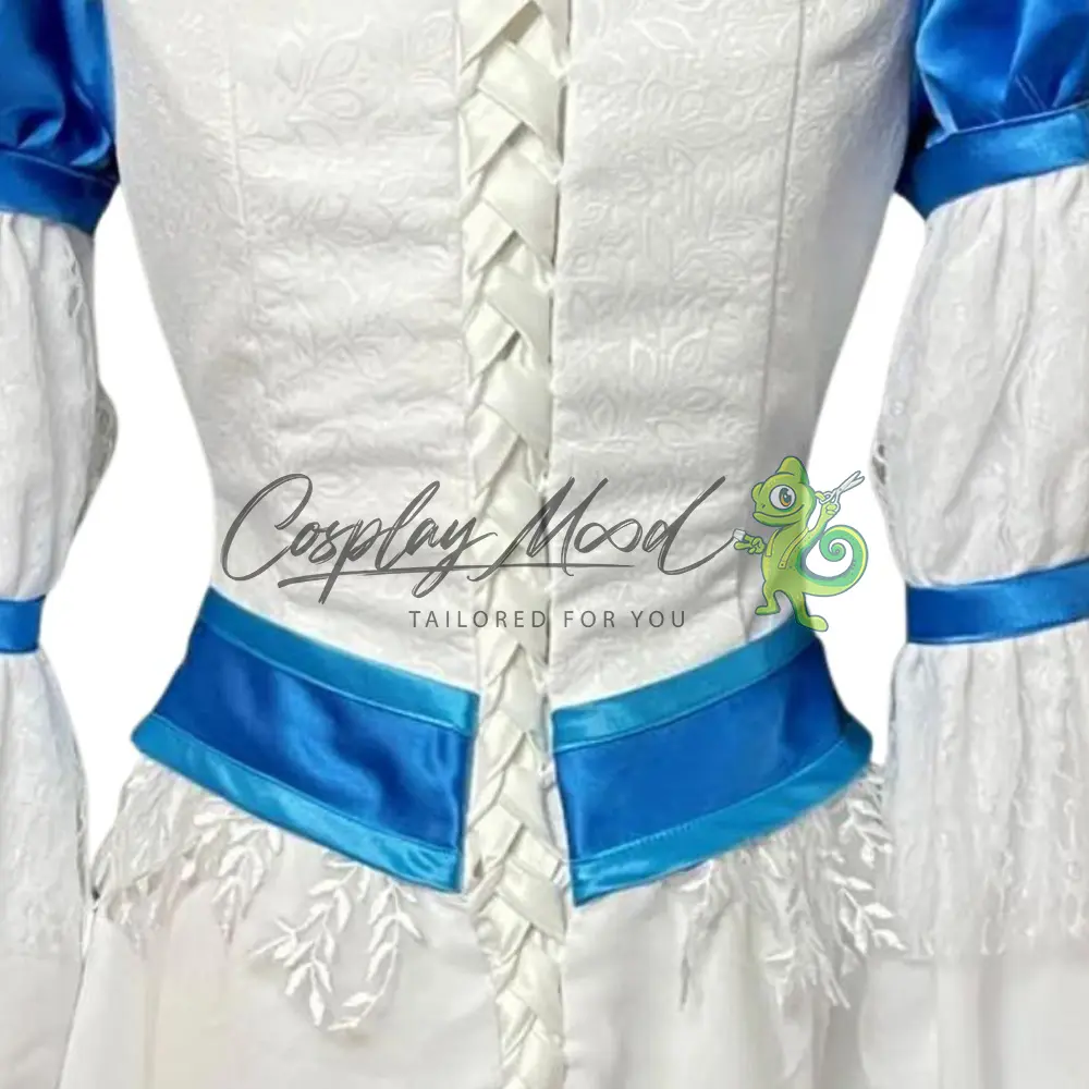 Abito lungo bianco con dettagli azzurri, elegante e regale, con inserti in raso per un effetto raffinato, maniche a sbuffo con decorazioni in pizzo, che donano un tocco principesco, gioiello decorativo frontale, gonna fluida e ampia, ideale per movimenti armoniosi e scenici.