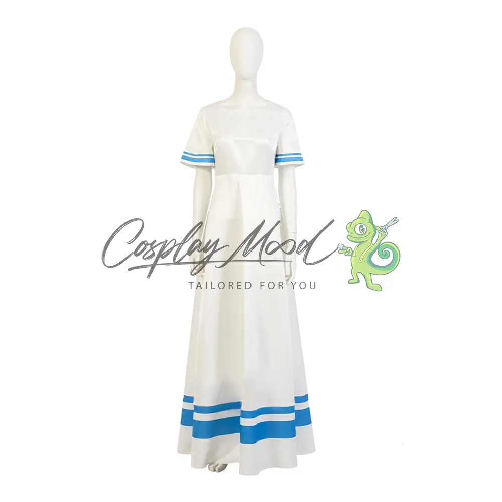 Vestito bianco con righe blu, veste rosa con decorazioni dorate, collana rossa, mantello con spalline e chiusura con collana dorata, orecchini, tiara dorata con gemma rossa, bracciali e cintura con pendagli. Le orecchie da elfo e le scarpe possono essere acquistate separatamente su richiesta.