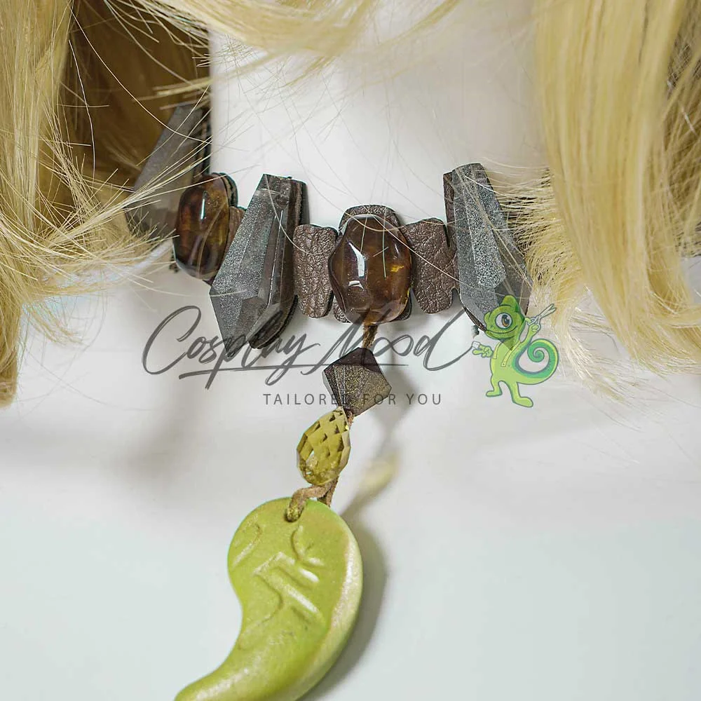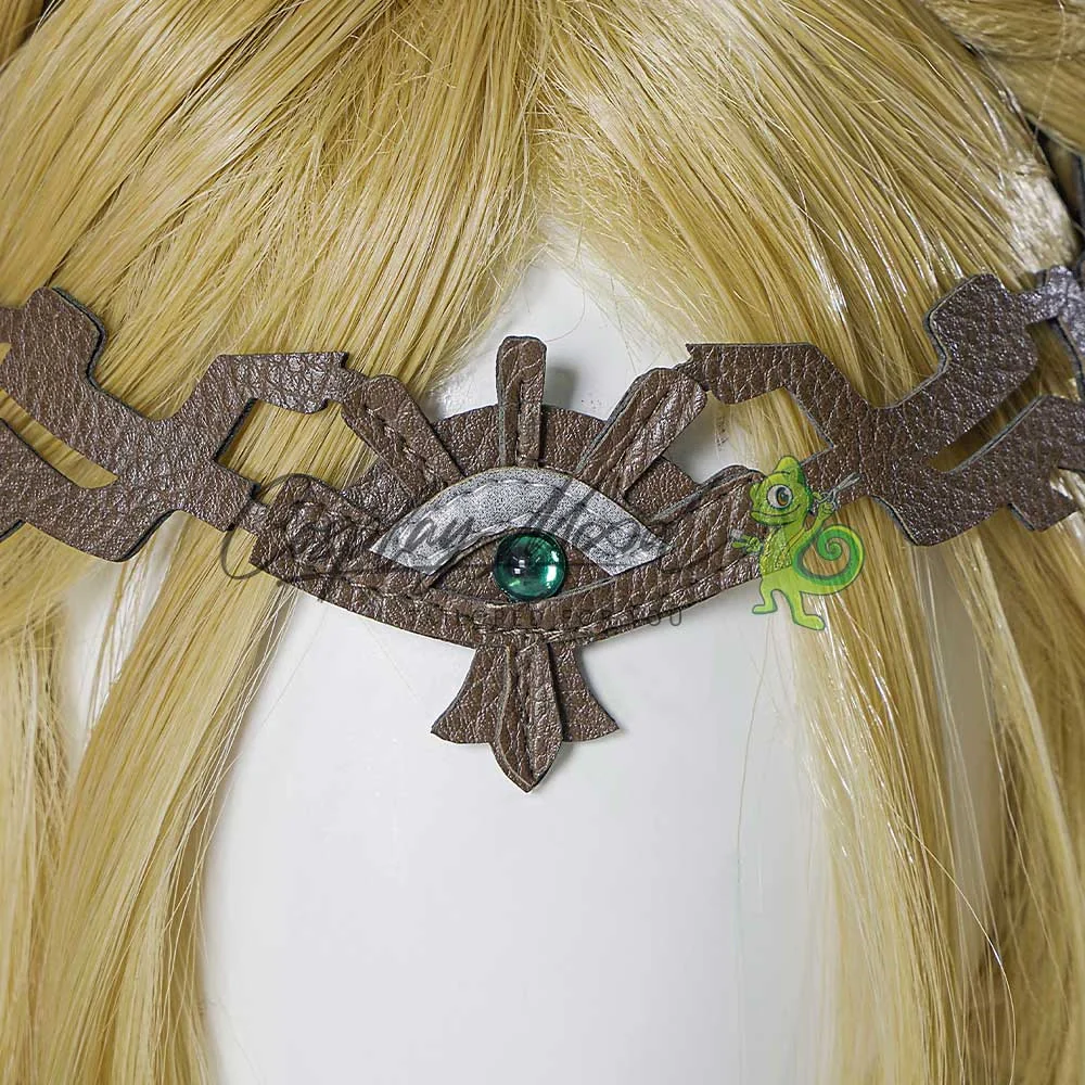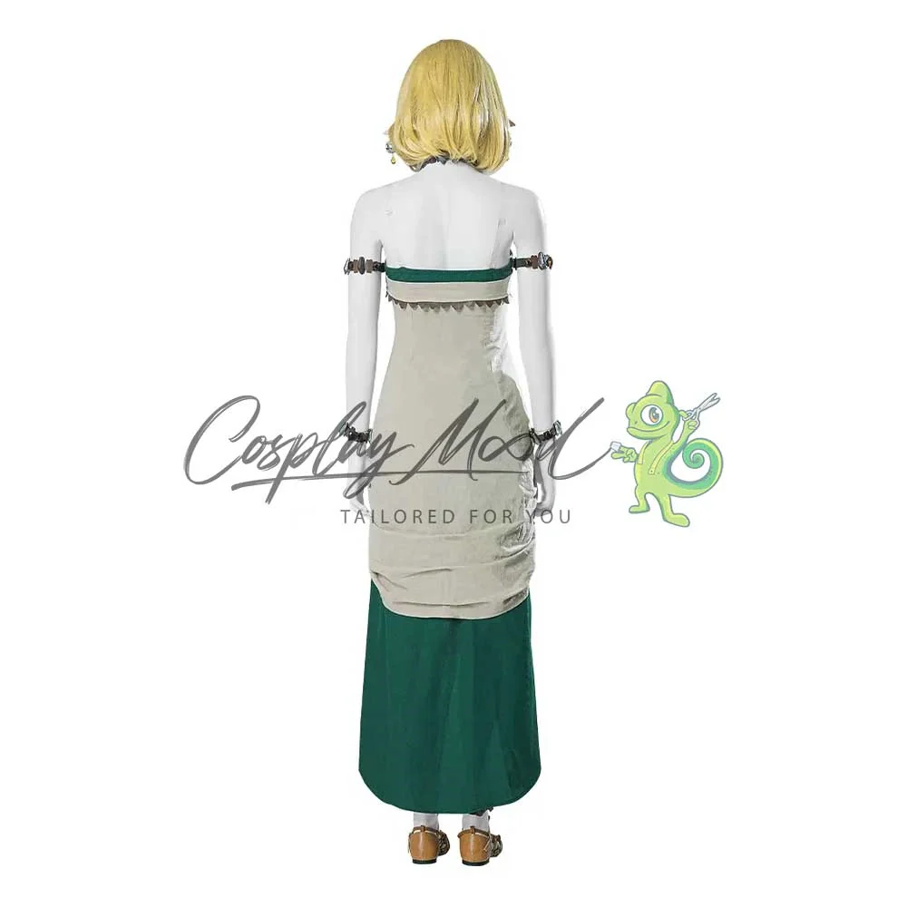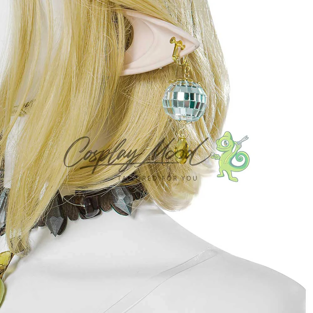 Vestito lungo verde e bianco con decorazione marrone in rilievo e pendagli, diadema, orecchie da elfo, orecchini, collana con pendente, cavigliera, braccialetti e ornamenti per braccia. (Parrucca, scarpe e tavoletta Sheikah ordinabili separatamente, contattare il servizio clienti se interessati).