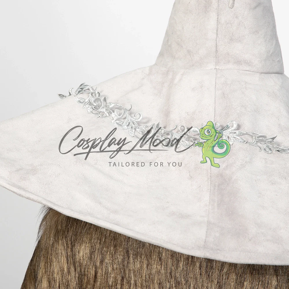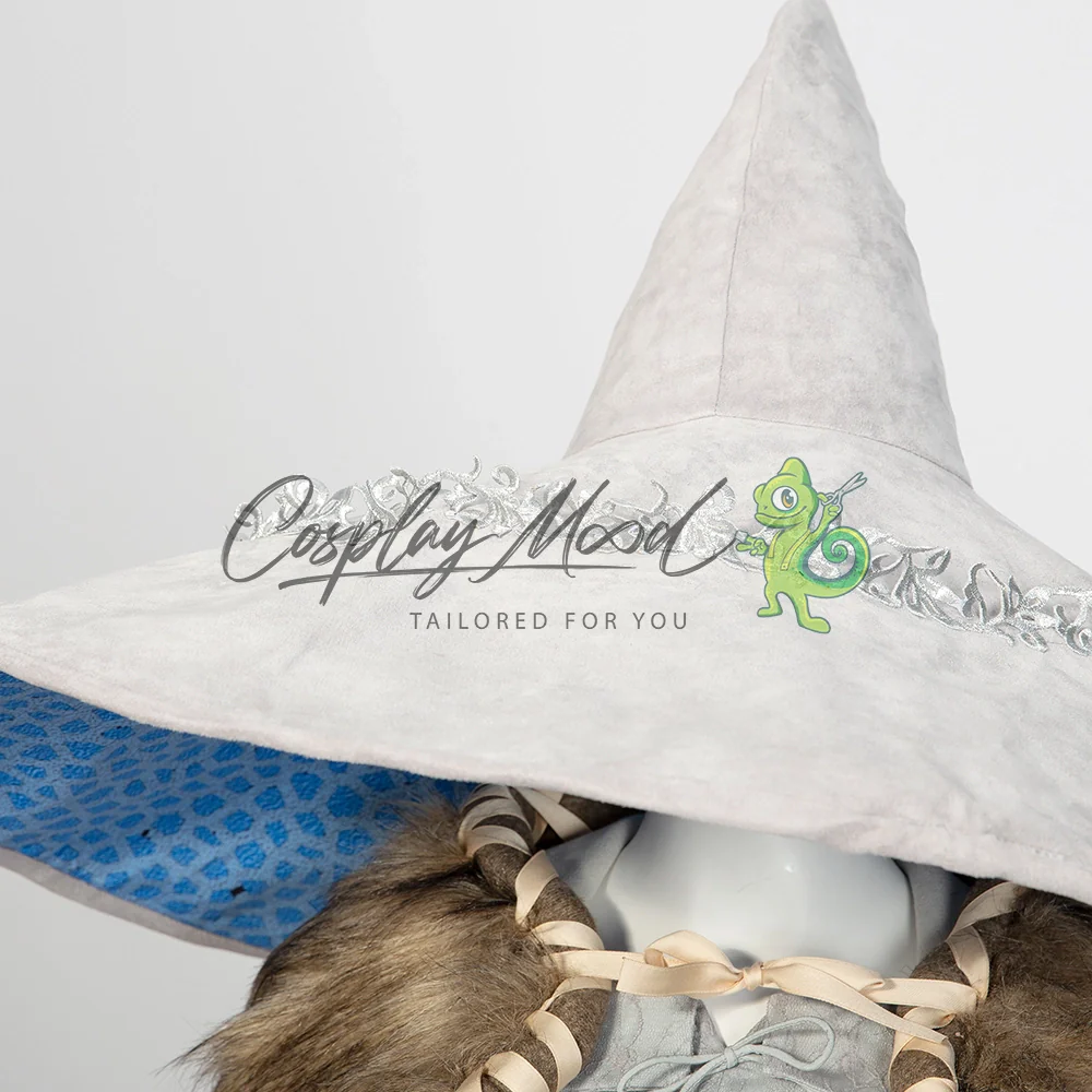 Tunica lunga bianca con cintura morbida in vita, decorazioni sul petto e apertura frontale, veste lunga grigio caldo con lacci, mantellina di peloncino con risvolto decorato, cappello largo con finiture in rilievo ed interno azzurro.