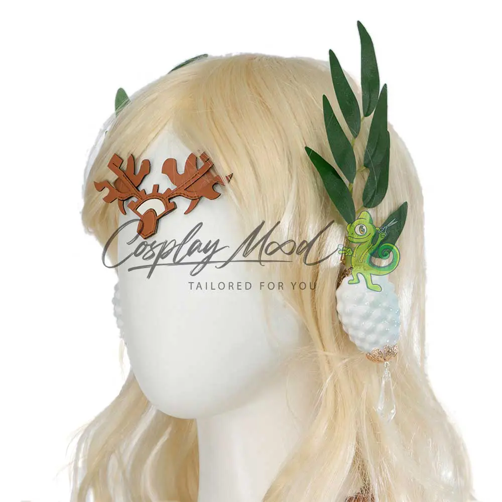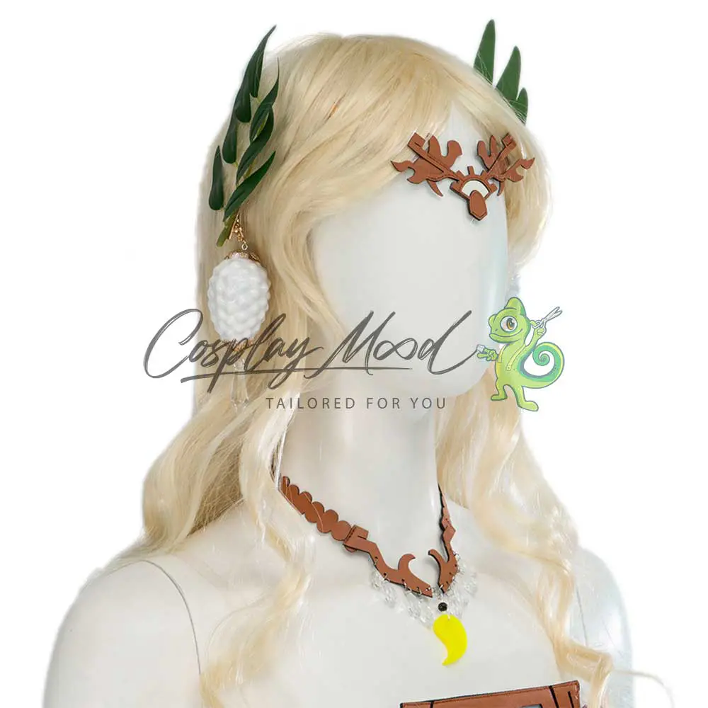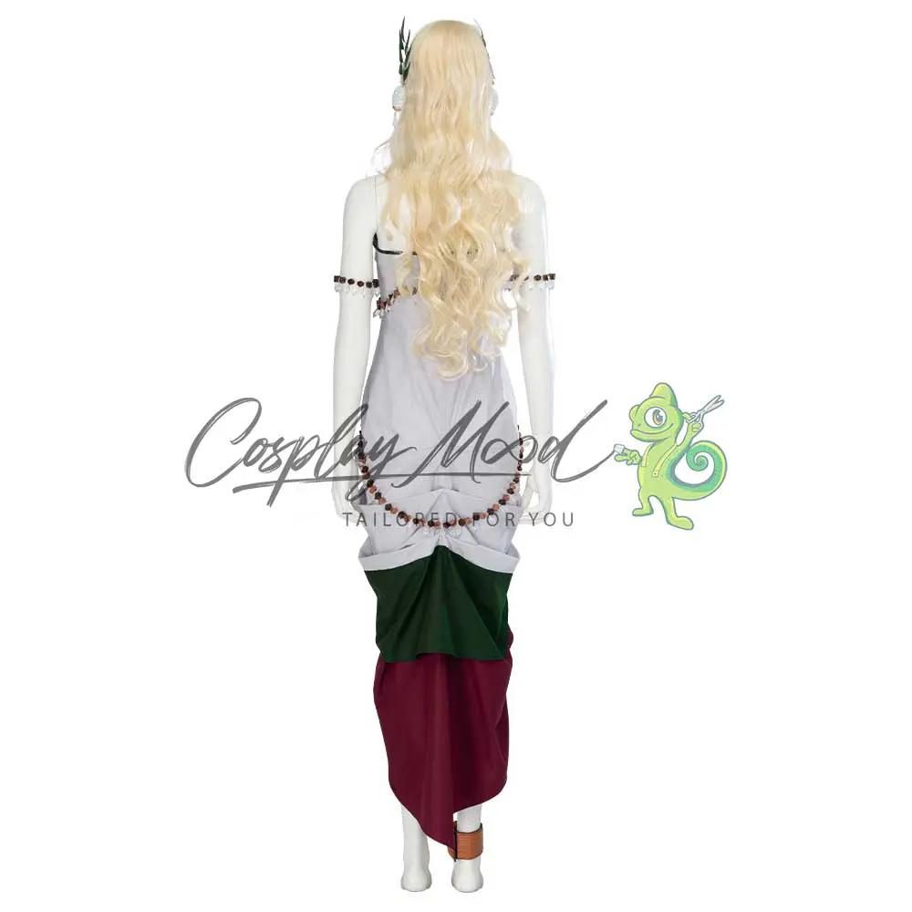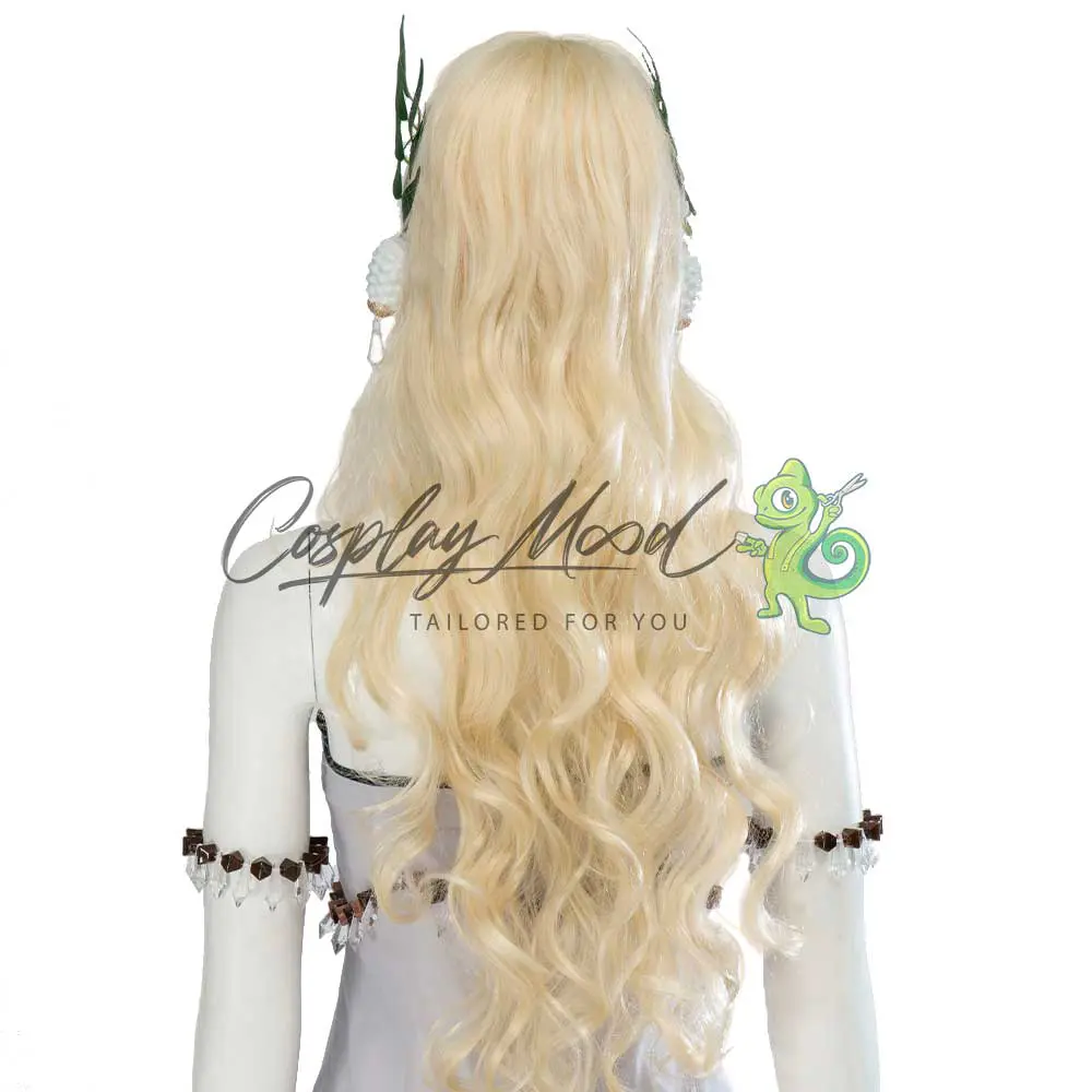 Vestito lungo con decorazioni in rilievo, orecchini bianchi, collana, bracciali, cinture, cavigliera, fermagli a forma di foglie. Parrucca ed orecchie da elfo ordinabili eventualmente in modo separato.