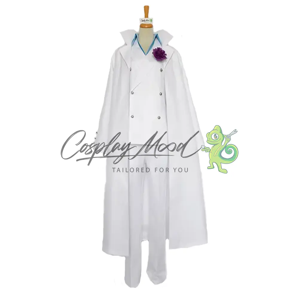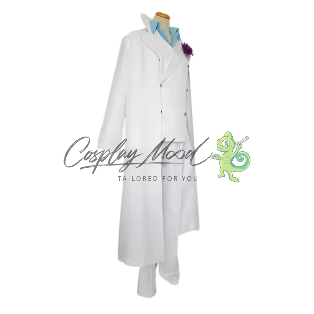 Camicia azzurra, giacca a doppio petto con bottoni e fiore decorativo, capello, cappotto bianco e pantaloni in coordinato.