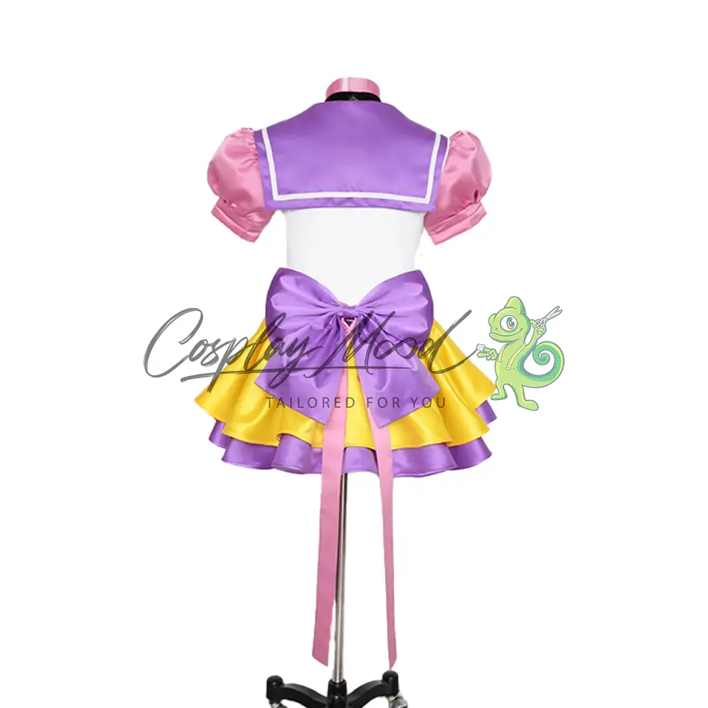 Vestito alla marinaretta con maniche a palloncino rosa, gonna gialla e sottogonna viola, choker rosa, guanti lunghi bianchi e rosa, fiocco posteriore per la schiena con strascico.