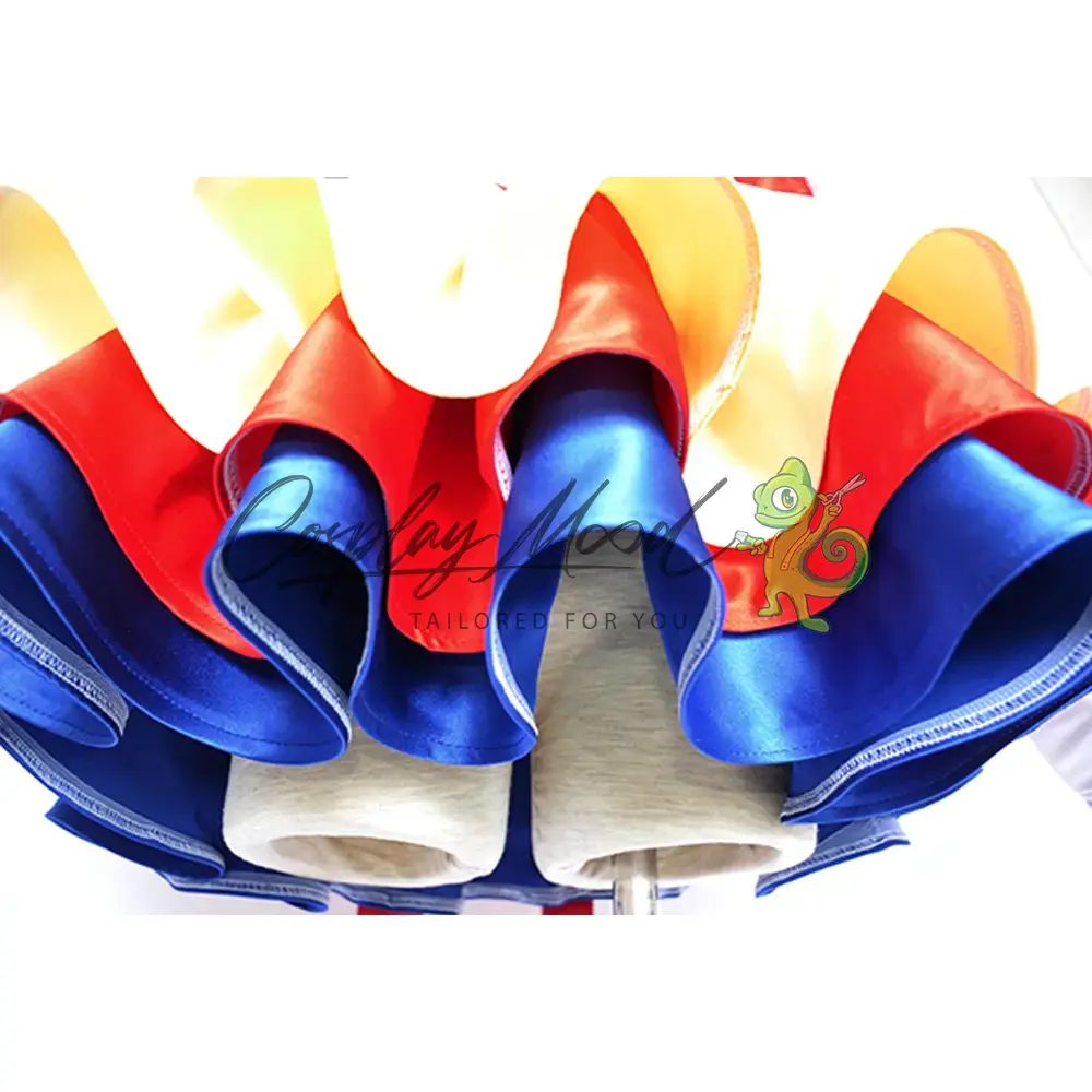 Vestito alla marinaretta con maniche a palloncino rosa, gonna gialla e sottogonna rossa e blu, collana choker rossa, guanti lunghi bianchi e rossi, fiocco posteriore per la schiena con strascico di colore rosso.