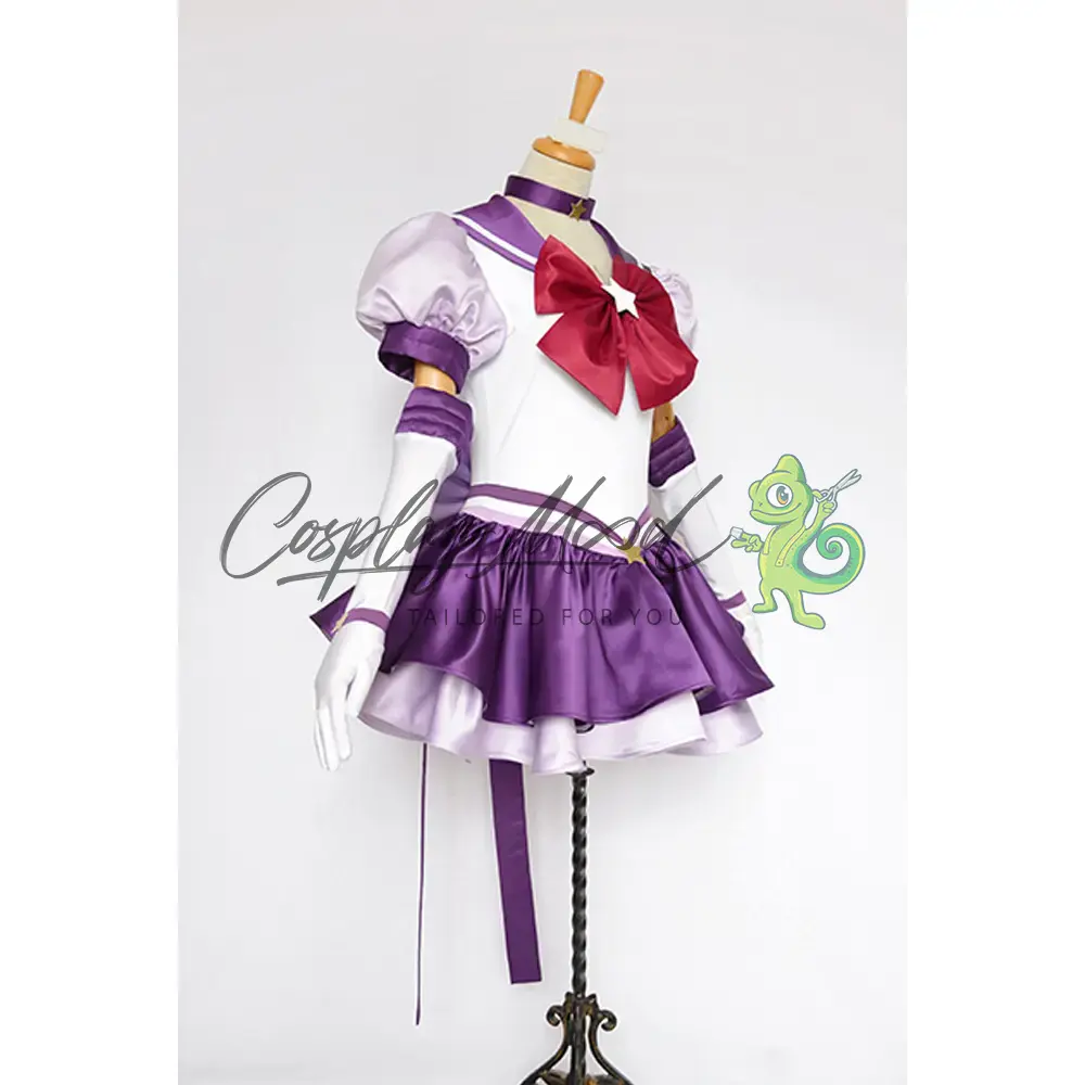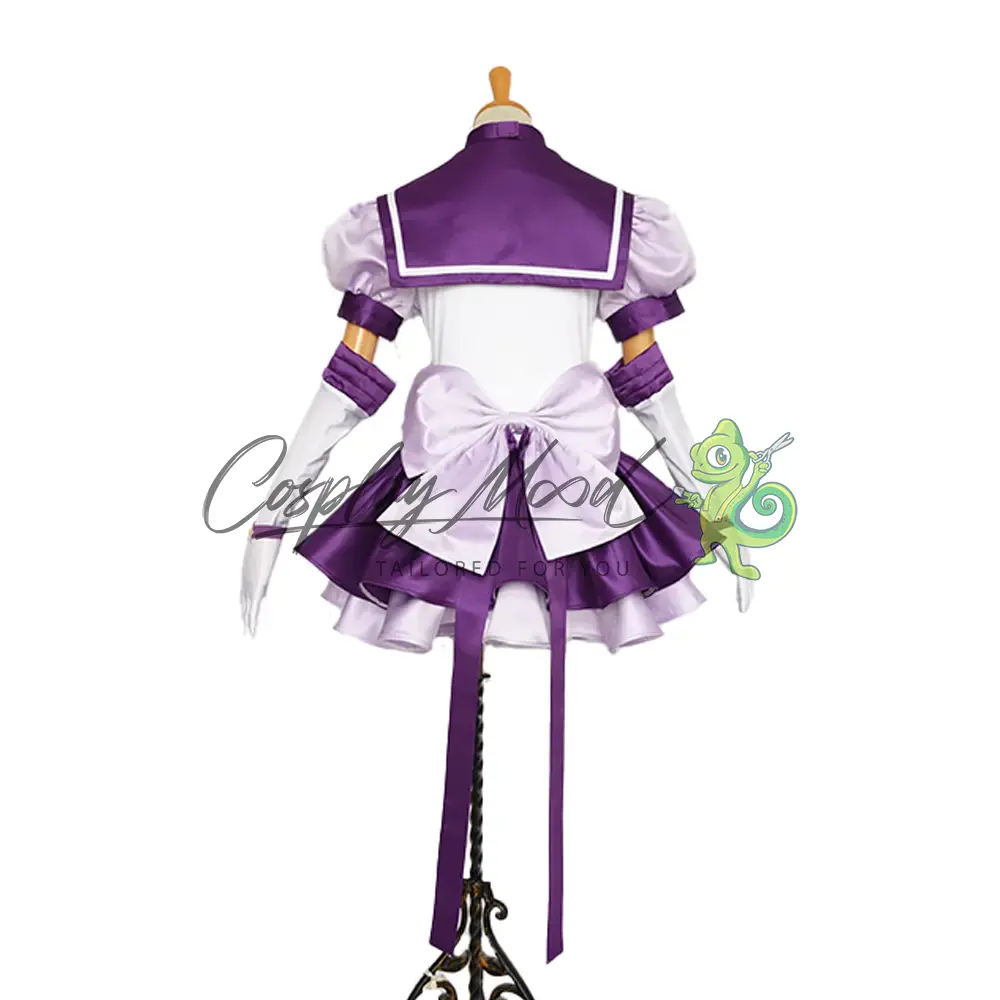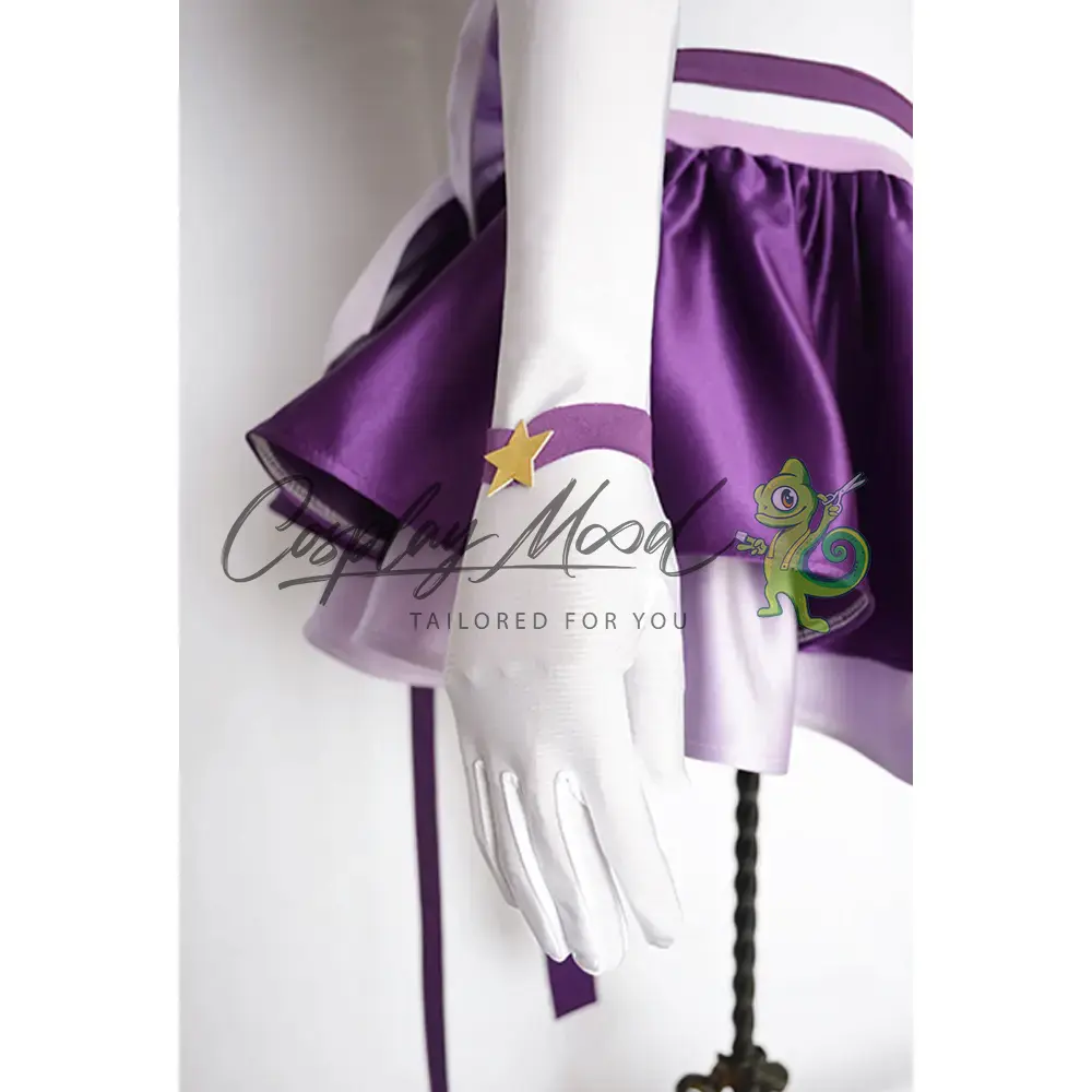 Vestito alla marinaretta con maniche a palloncino color lilla, gonna viola e sottogonna lilla, choker viola con decorazione a stella, guanti lunghi bianchi e viola, fiocco posteriore per la schiena con strascico.