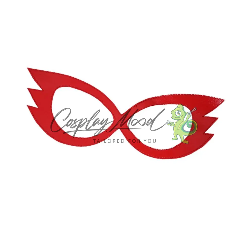 Maschera rossa con alette laterali, fiocco rosso con decorazione centrale, collana con luna, divisa alla marinaretta, gonna blu con fiocco posteriore e guanti abbinati.