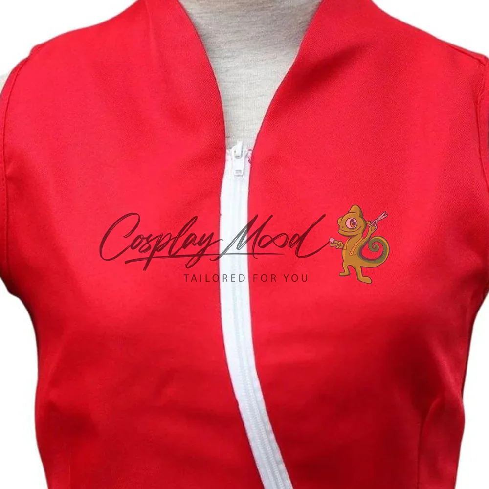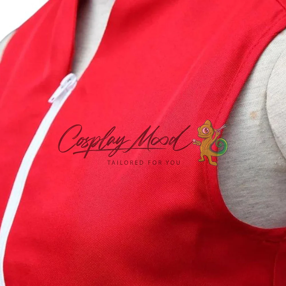 Giacca rossa con cerniera laterale bianca, pantaloncini neri e gonna rosa, guanti neri, manicotti rosa e borselli.