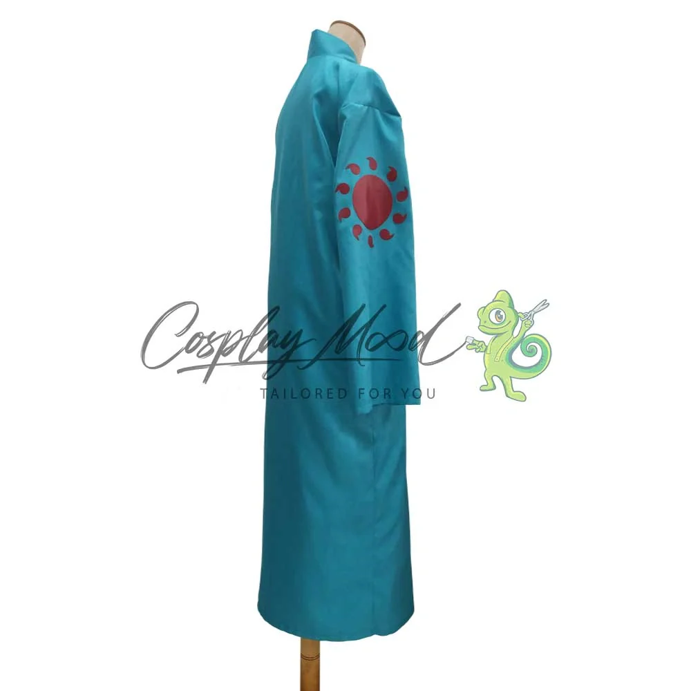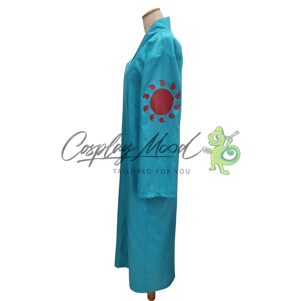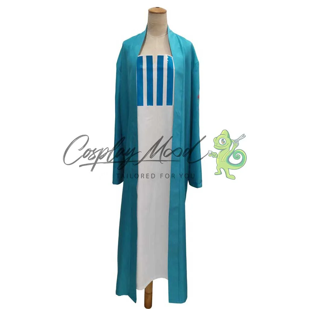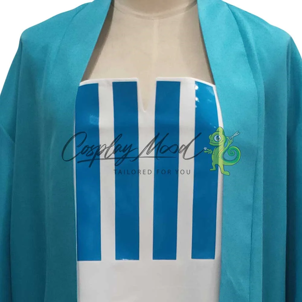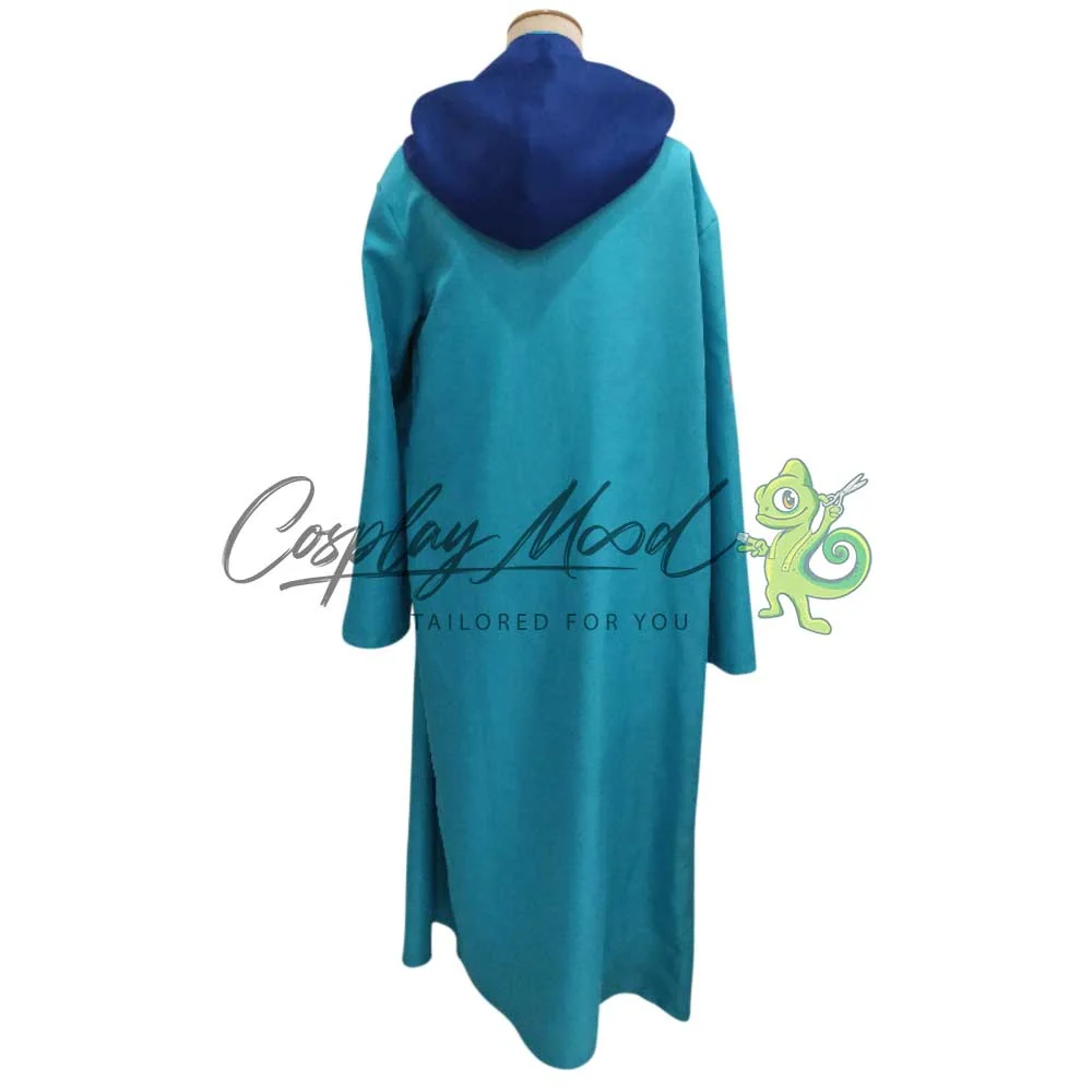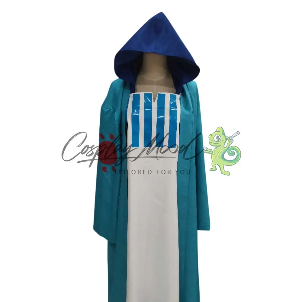 Un lungo cappotto azzurro, con cappuccio blu e trama del sole. Veste lunga bianca con righe azzurre sul petto.