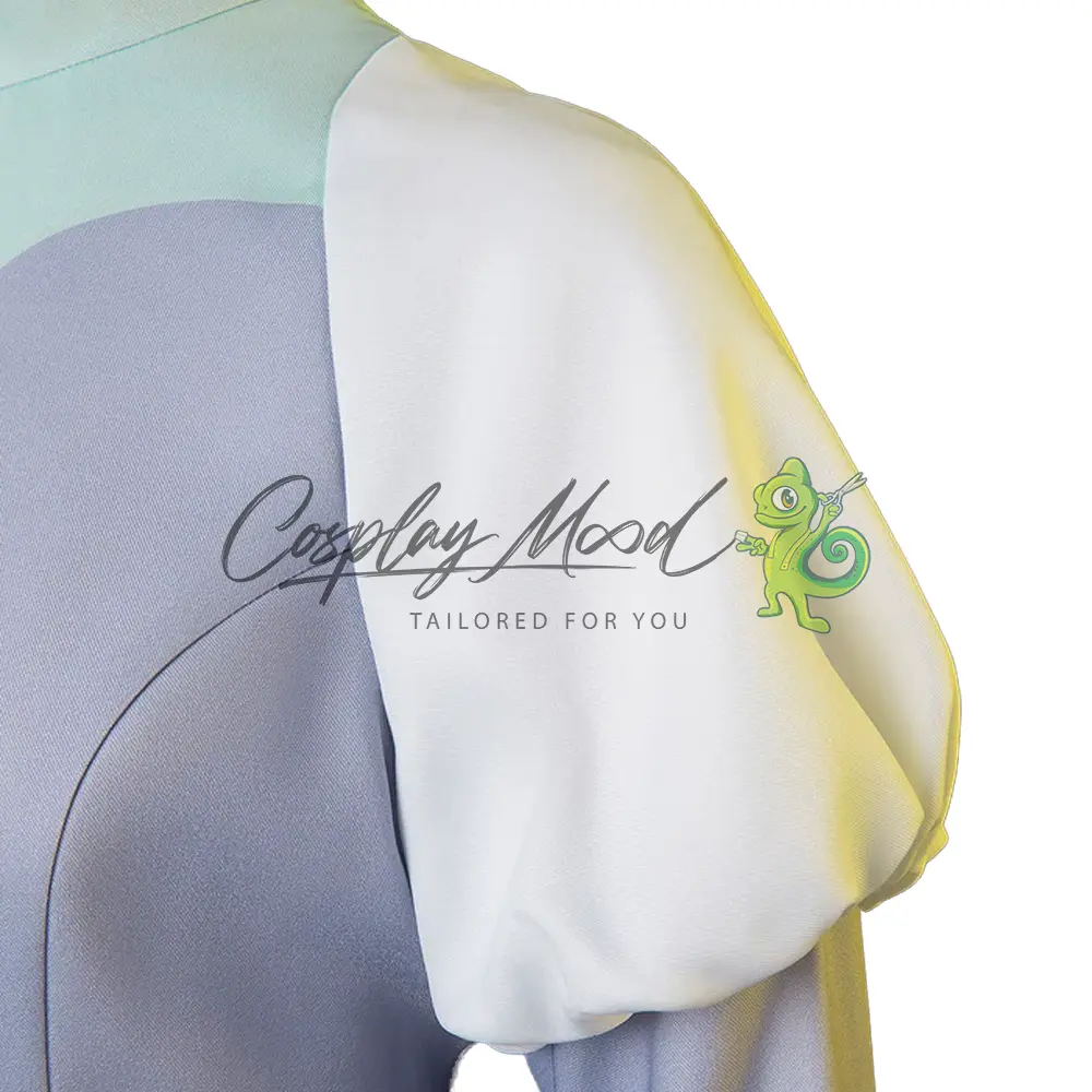 Parte superiore del vestito con maniche a palloncino bianche, colletto azzurro mare, busto lilla, maniche lunghe bianche e lilla, gonna lunga a più strati color lilla, verde chiaro e bianco, bordata di lilla.