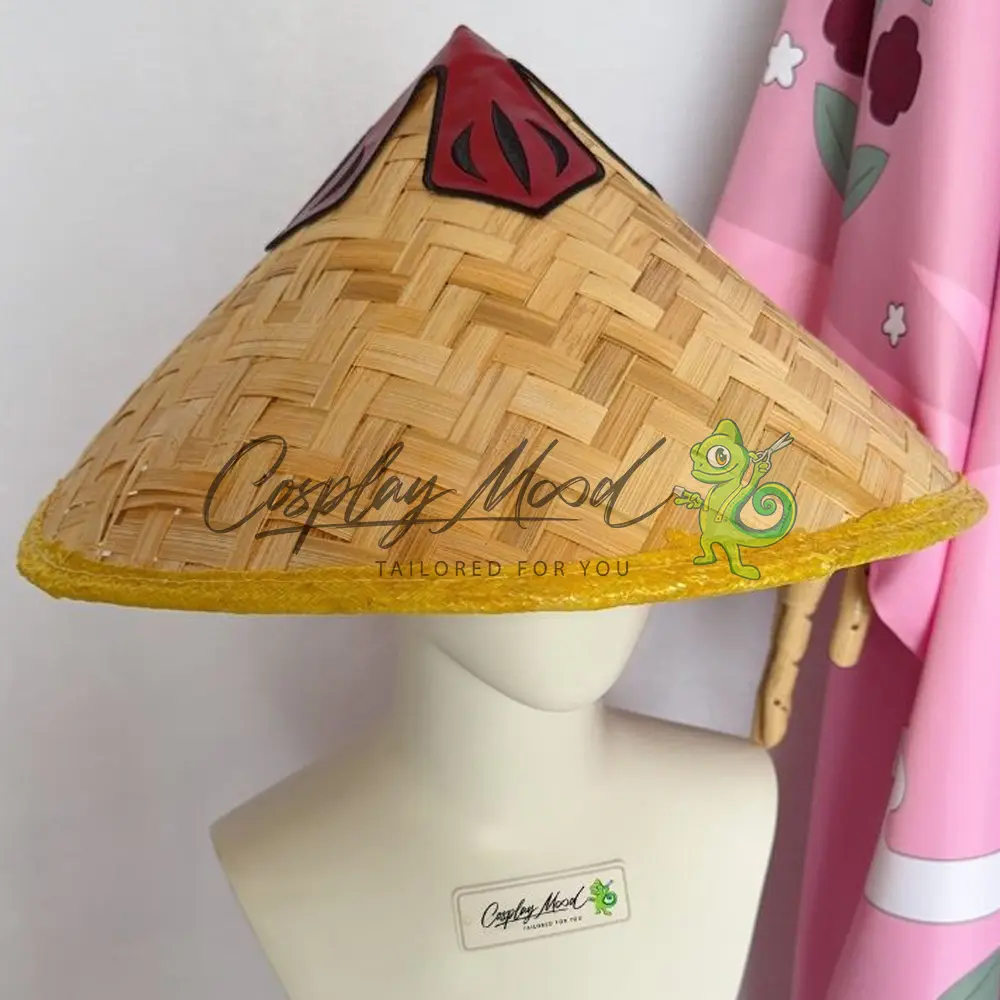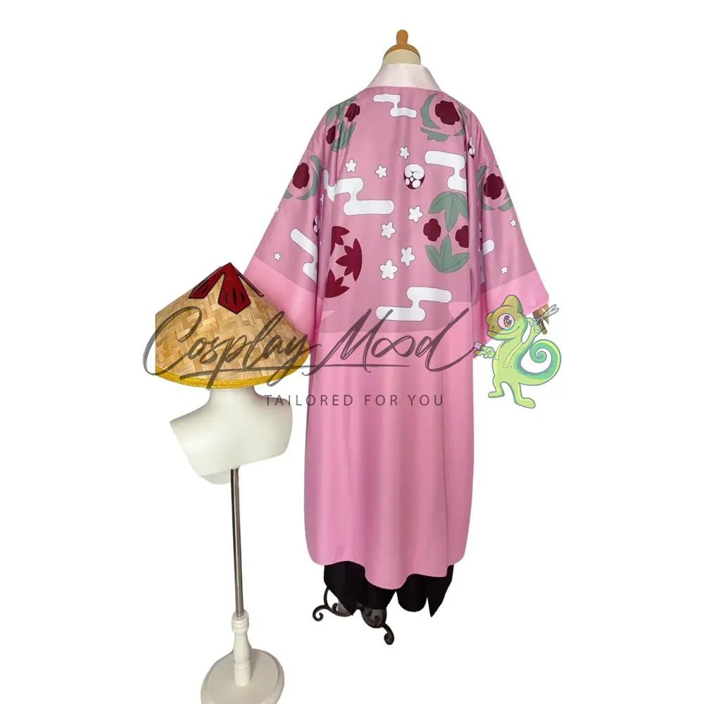 Kimono rosa con motivo floreale, cappello di paglia con logo rosso, Hakama e kimono neri, veste bianca con logo della divisione, fascia turchese.