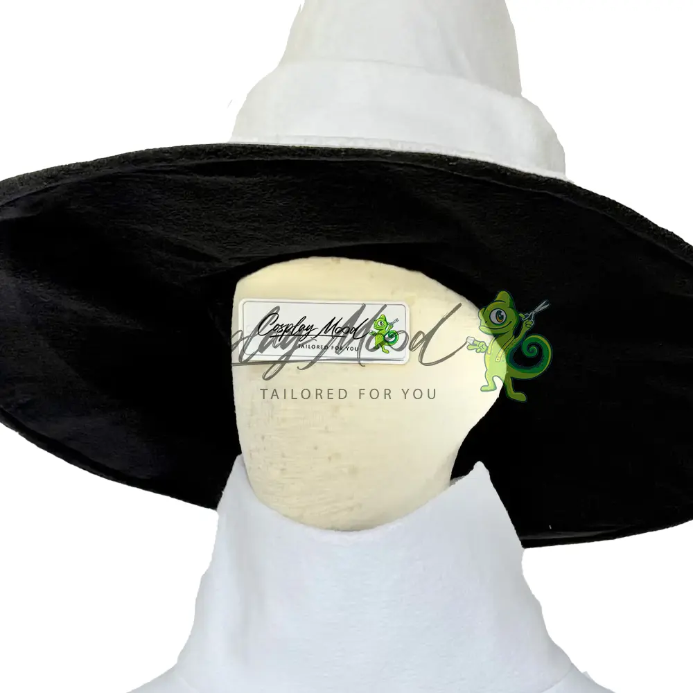 Ampio cappello a punta bianco con interno nero, mantella a collo alto sempre color bianco fermata con spille da balia come da materiale originale.