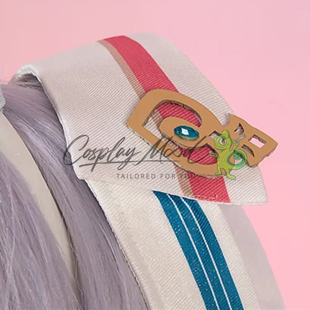 Fiocco con fibbia dorata morbida, vestito con grembiulino, pantaloncini neri con decorazioni a coniglietto, giacca azzurra, coda morbida, guanti, passata con orecchie, codine per capelli, cappello da infermiera, cinturini per le gambe, calze lunghe e ghette bianche.