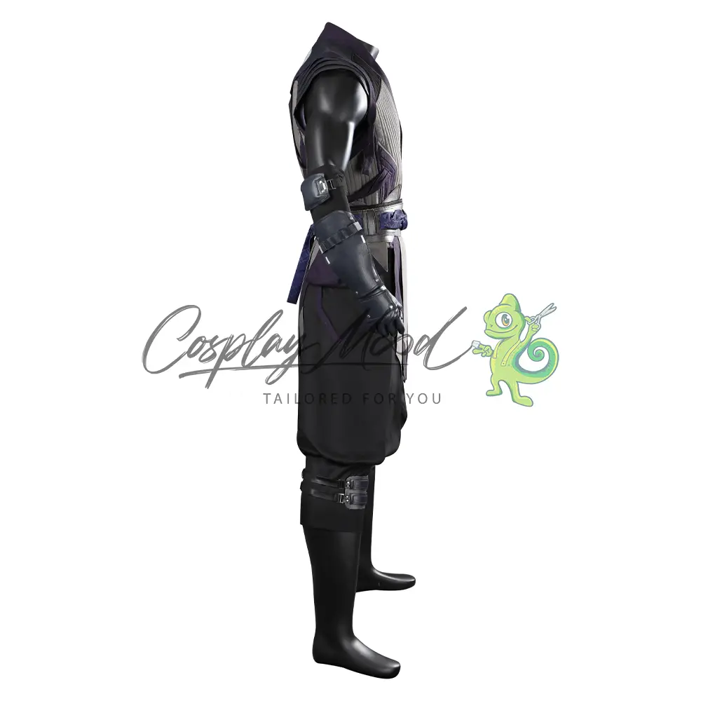 Gilet grigio con nastro viola e bordo, sopraveste con spalline in ecopelle nere, tunica con spilla grigia in rilievo, cintura in eco pelle con fascia viola arricciata, set di fasce, para braccia, guanti, pantaloni ampi neri. Scarpe vendibili separatmente su richiesta.