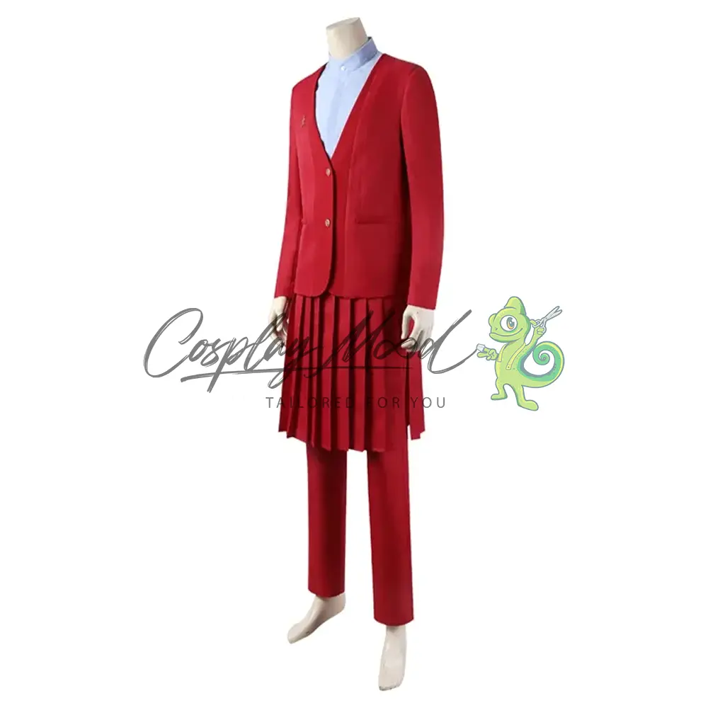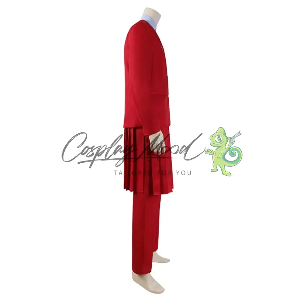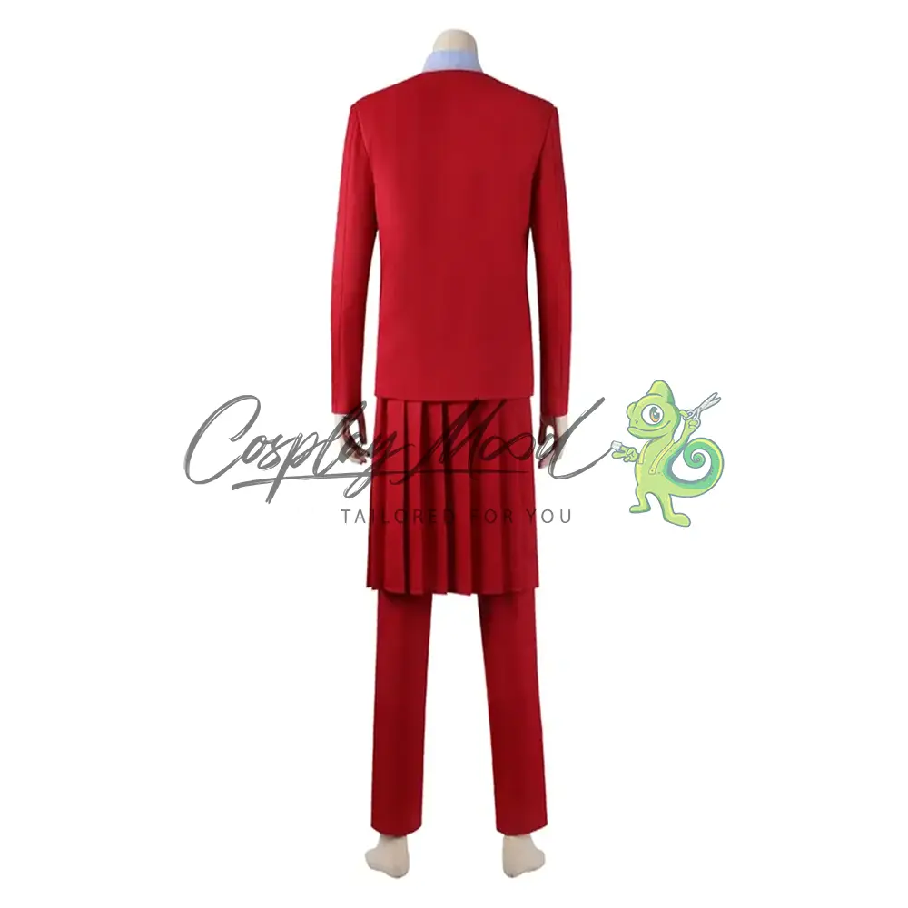 Camicia color cielo, giacca rossa con spilla e bottoni, pantaloni lunghi rossi e grembiule rosso.