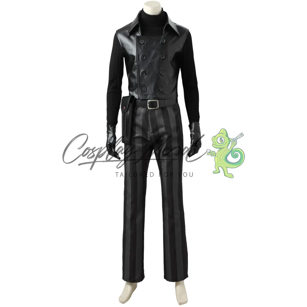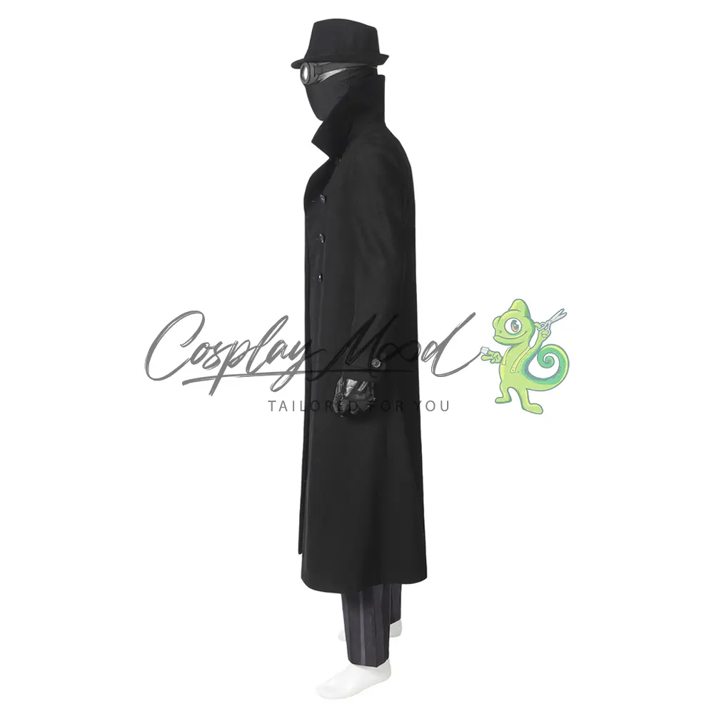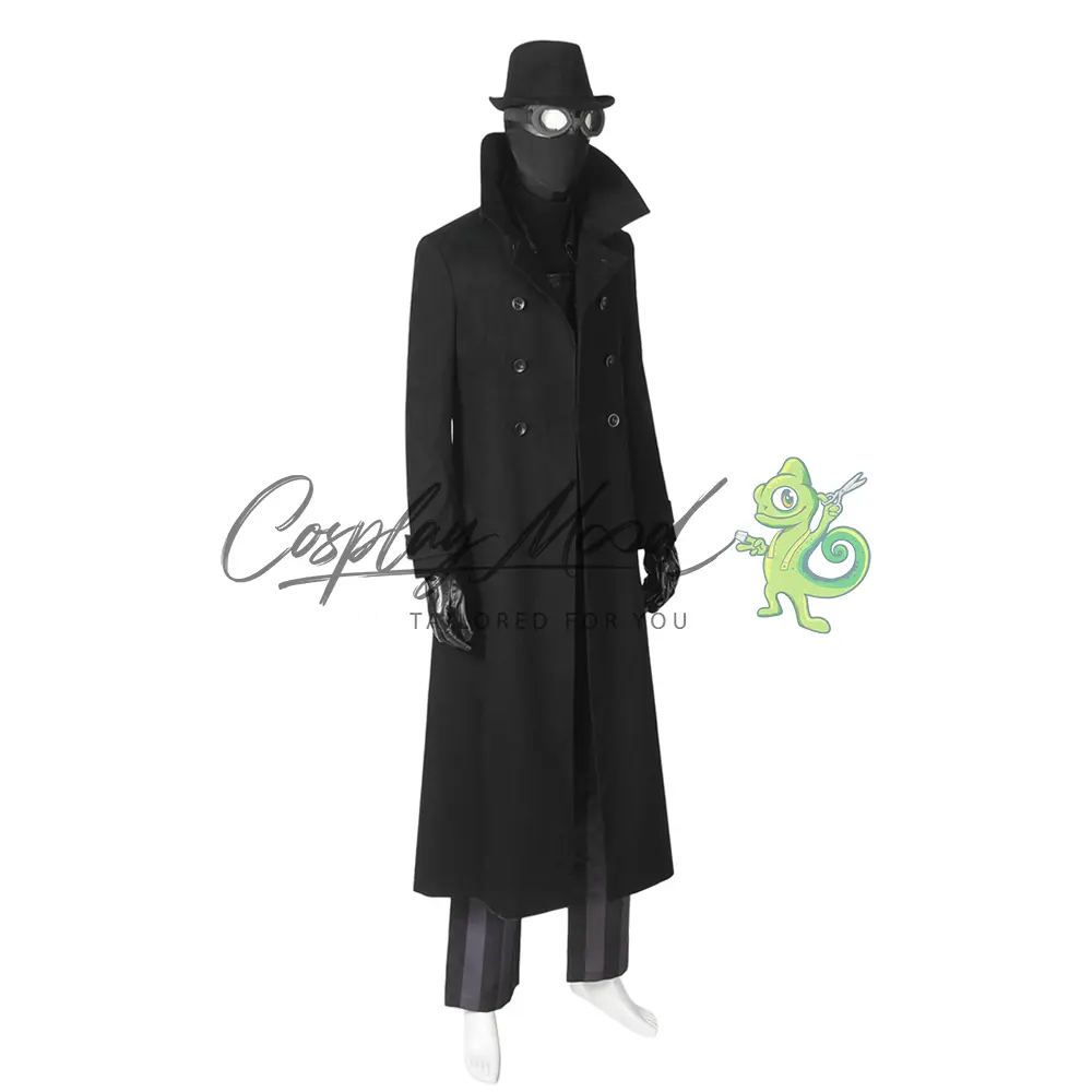Cappello nero, maschera con occhiali, cappotto lungo nero, gilet con doppio petto, maglia nera collo alto stile lupetto, guanti, cintura, fondina, pantaloni neri e grigi a righe. Gli stivali in coordinato sono ordinabili separatamente.