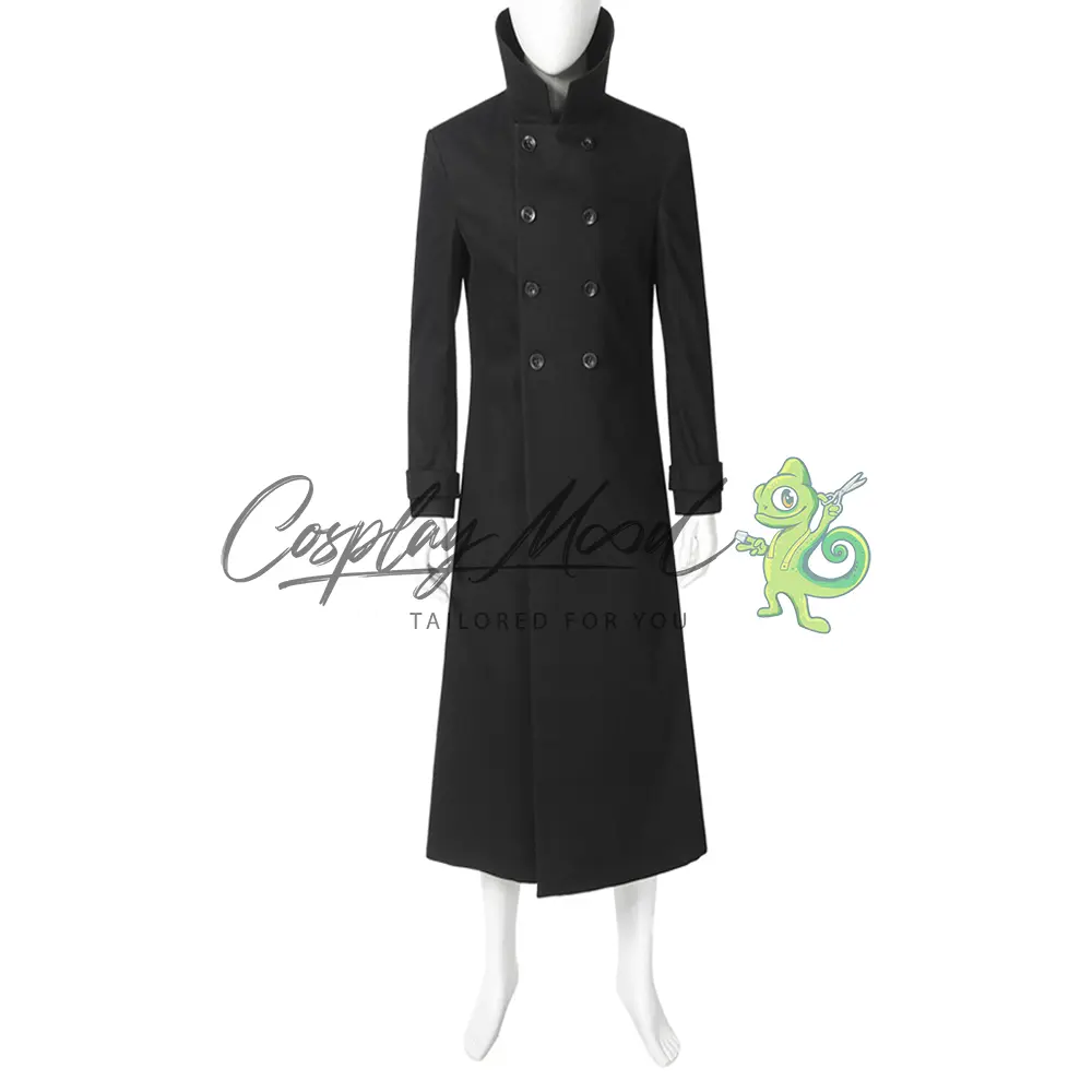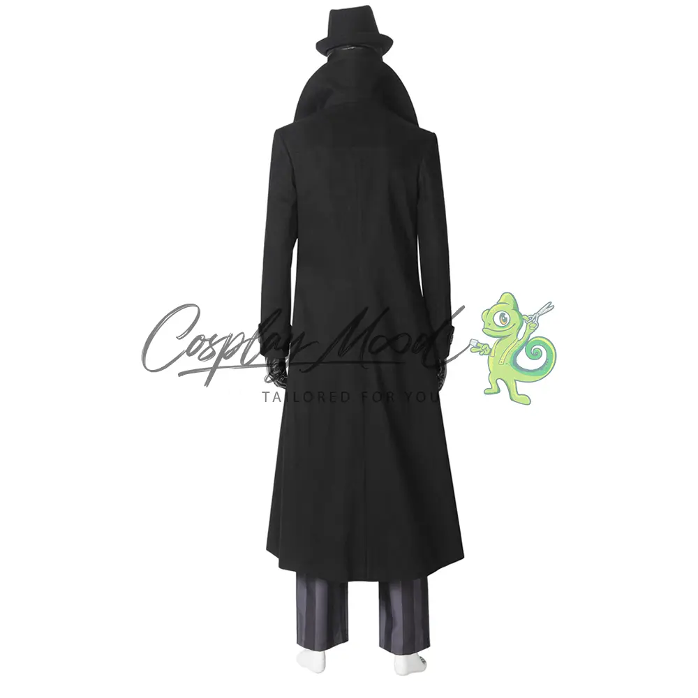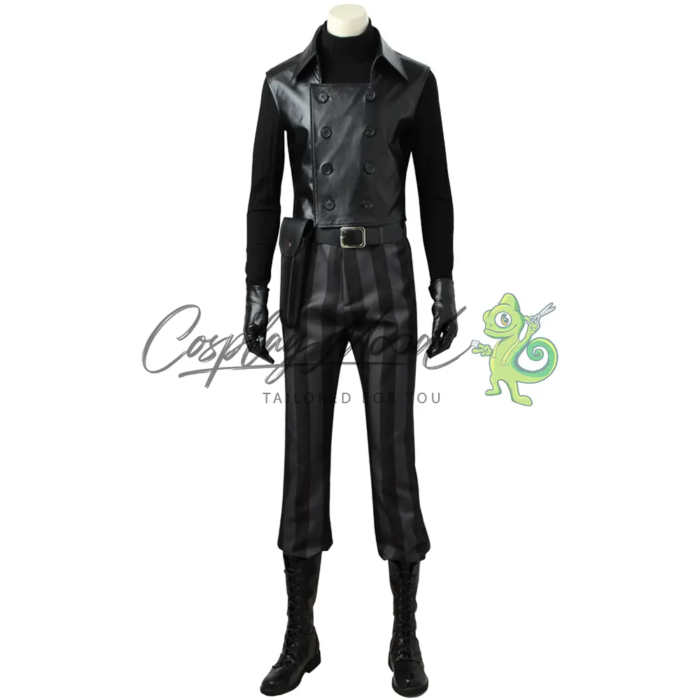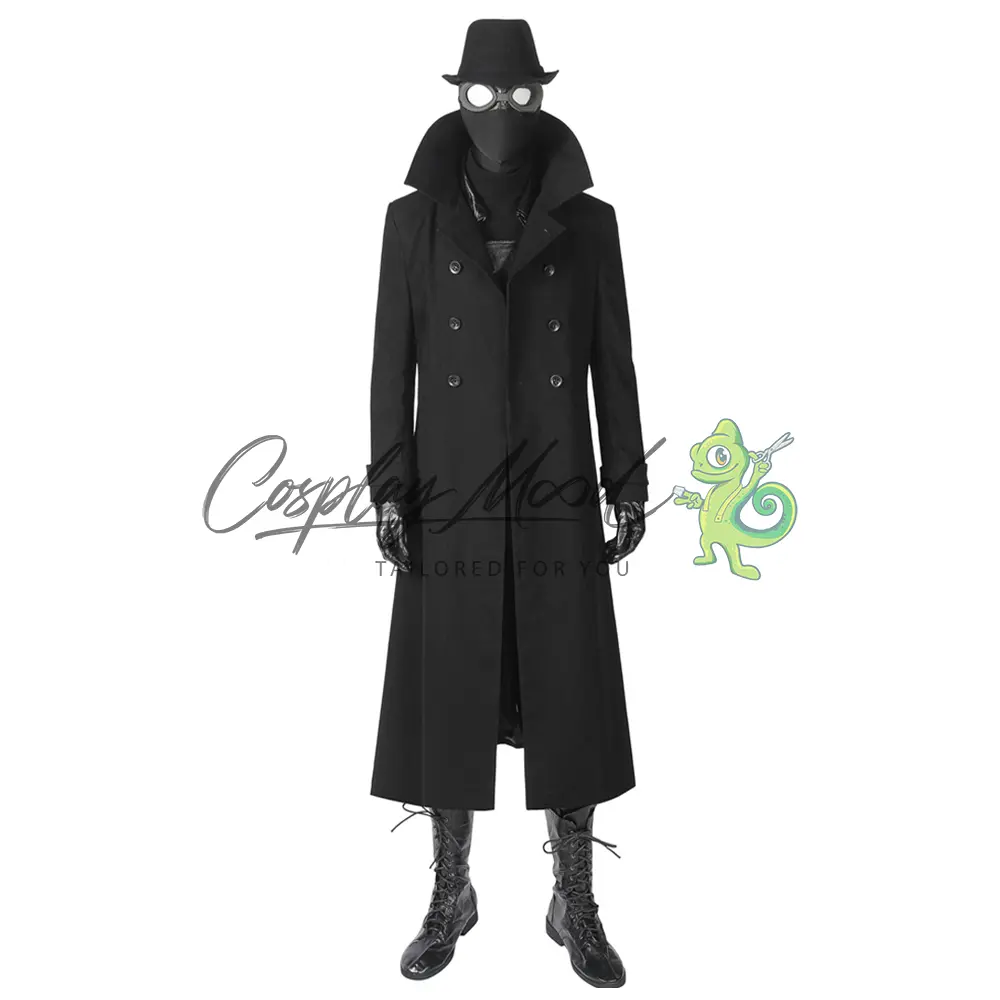 Cappello nero, maschera con occhiali, cappotto lungo nero, gilet con doppio petto, maglia nera collo alto stile lupetto, guanti, cintura, fondina, pantaloni neri e grigi a righe. Gli stivali in coordinato sono ordinabili separatamente.