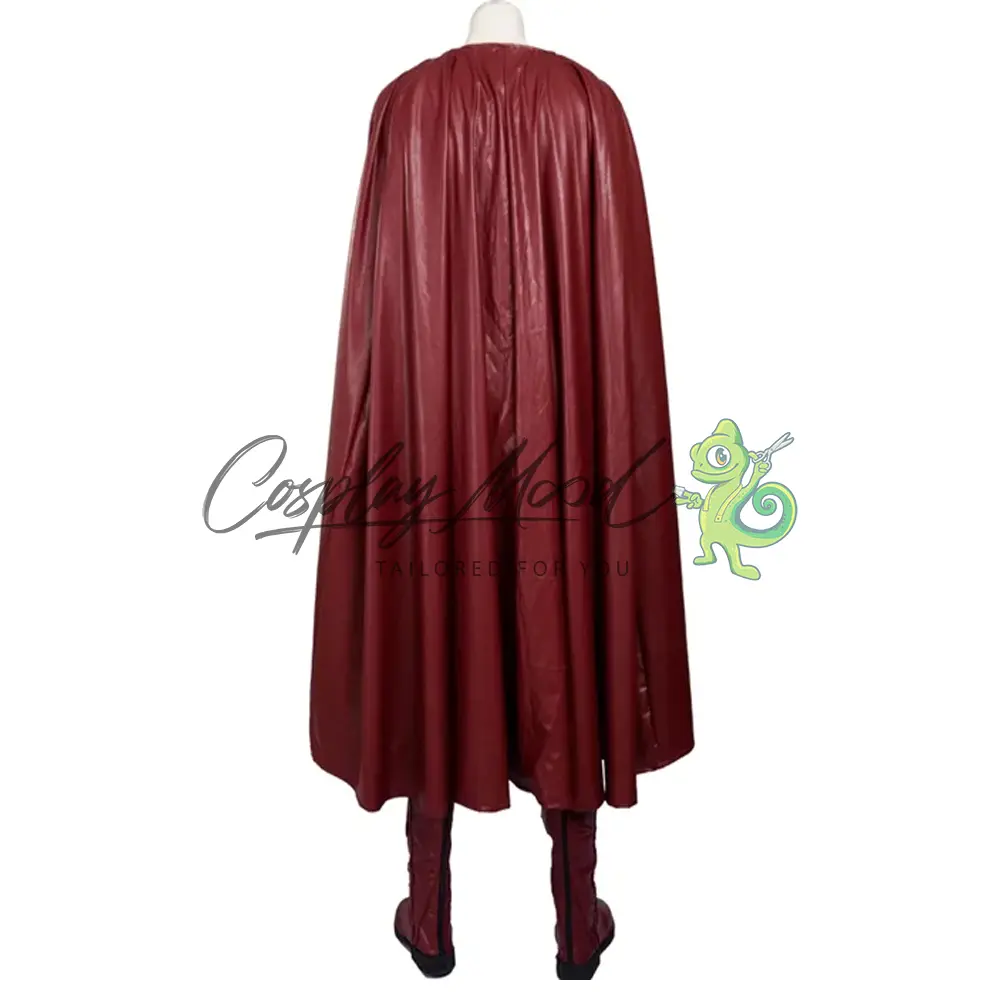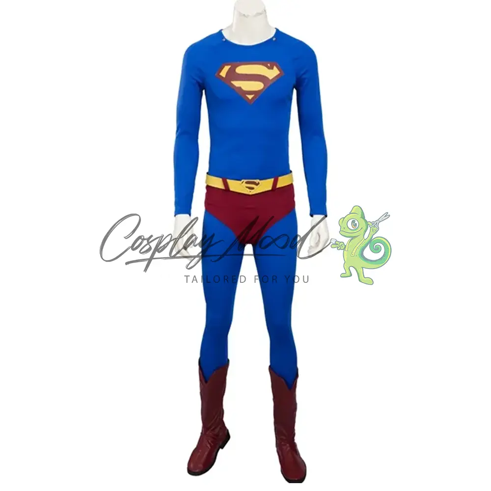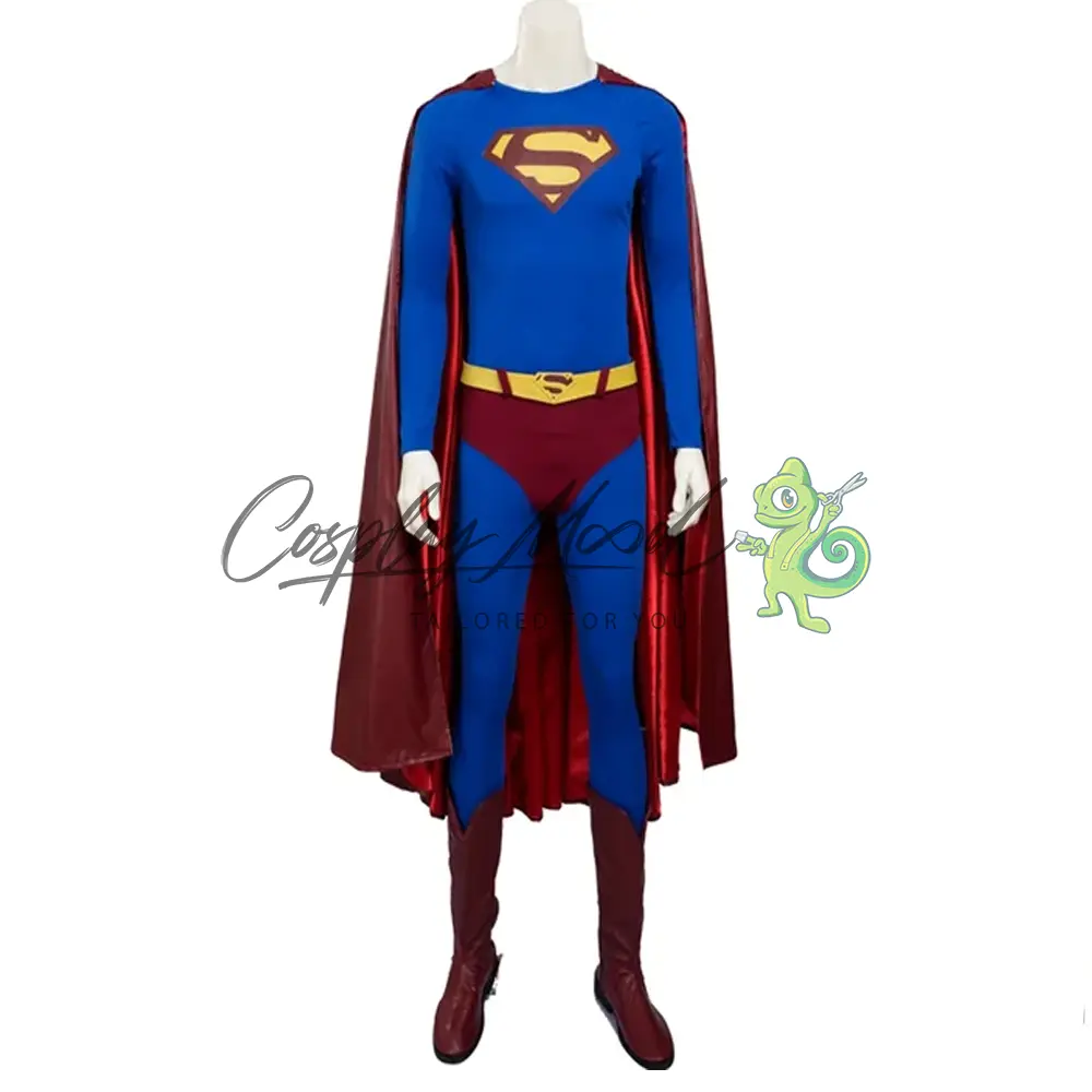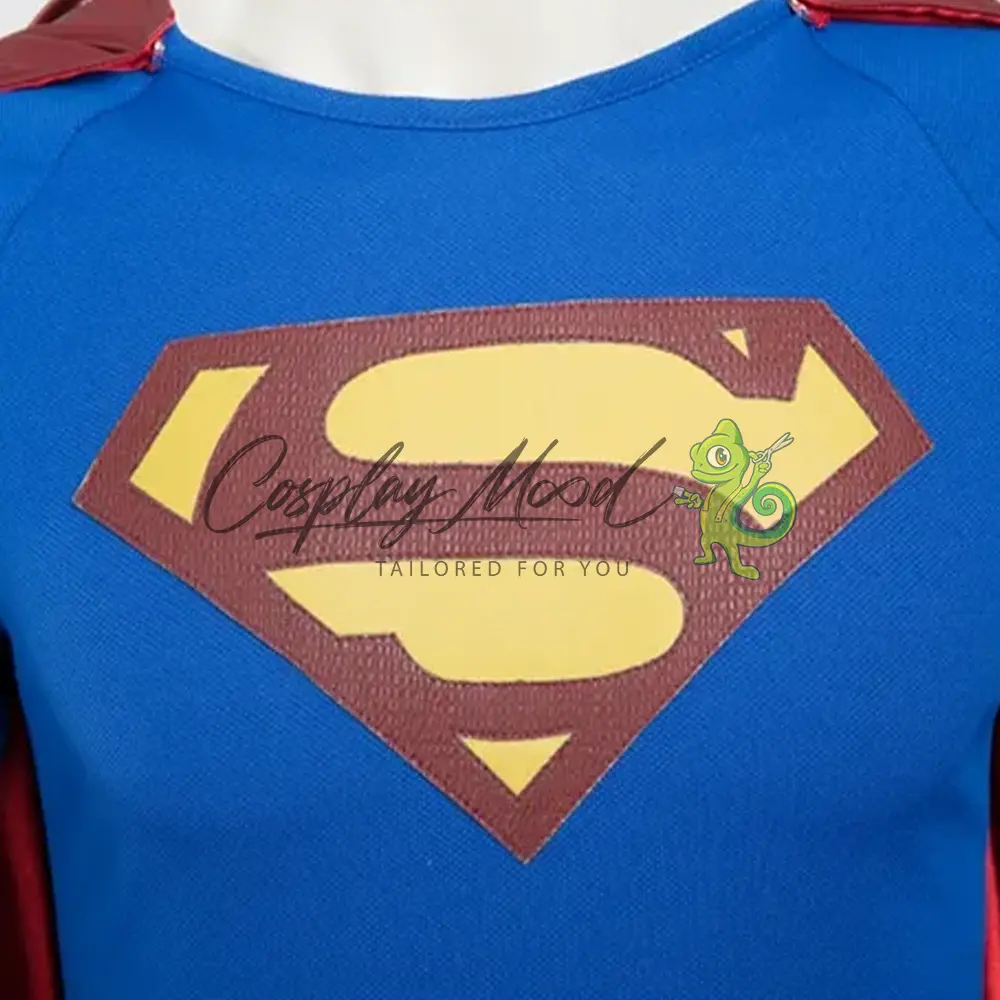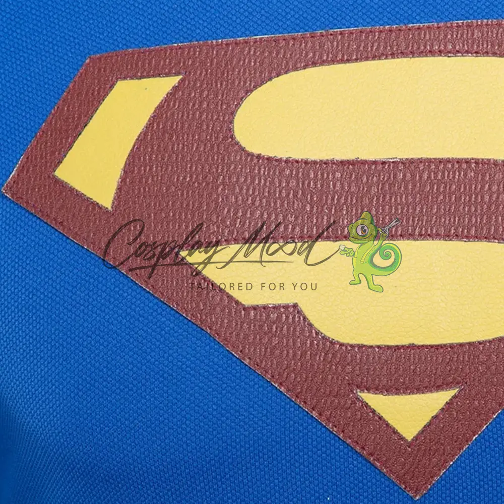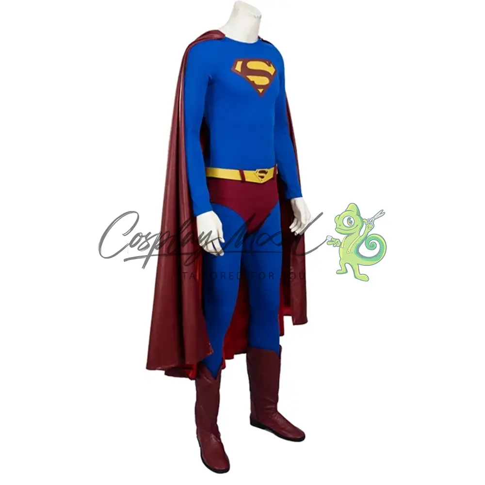 Tuta integrale blu con logo del supereroe sul petto, mantello lungo rosso con fissaggio frontale, shorts rossi, cintura gialla con logo della S. Stivali rossi venduti separatamente su richiesta.