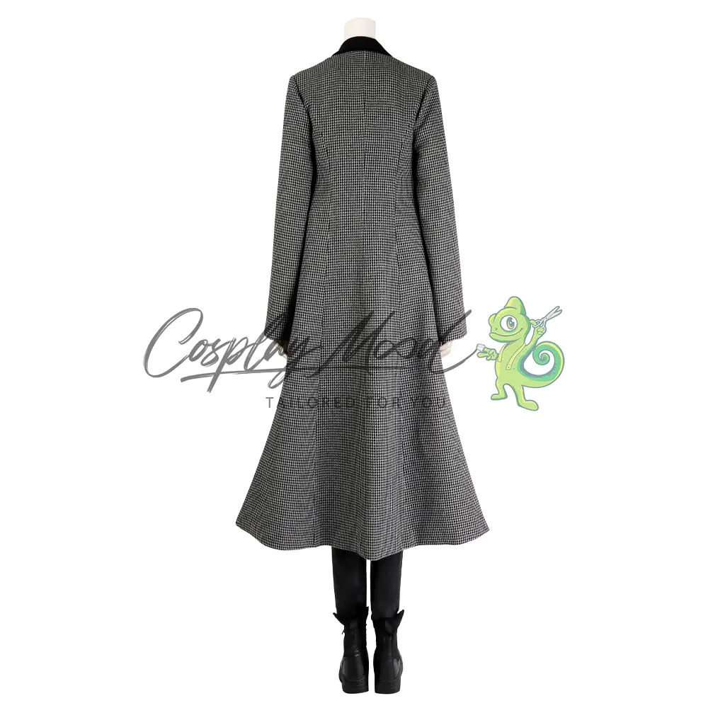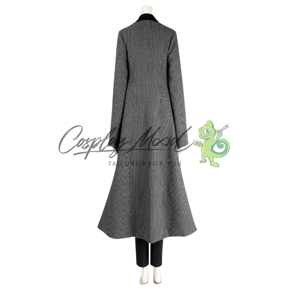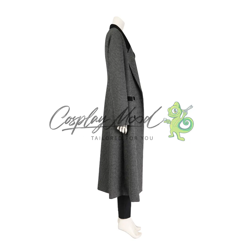 Cappotto lungo nero e grigio con bottoni, maglia nera, imbracatura, pantaloni lunghi neri, set di spillette e cinture in coordinato. Stivaletti abbinati vendibili separatamente.