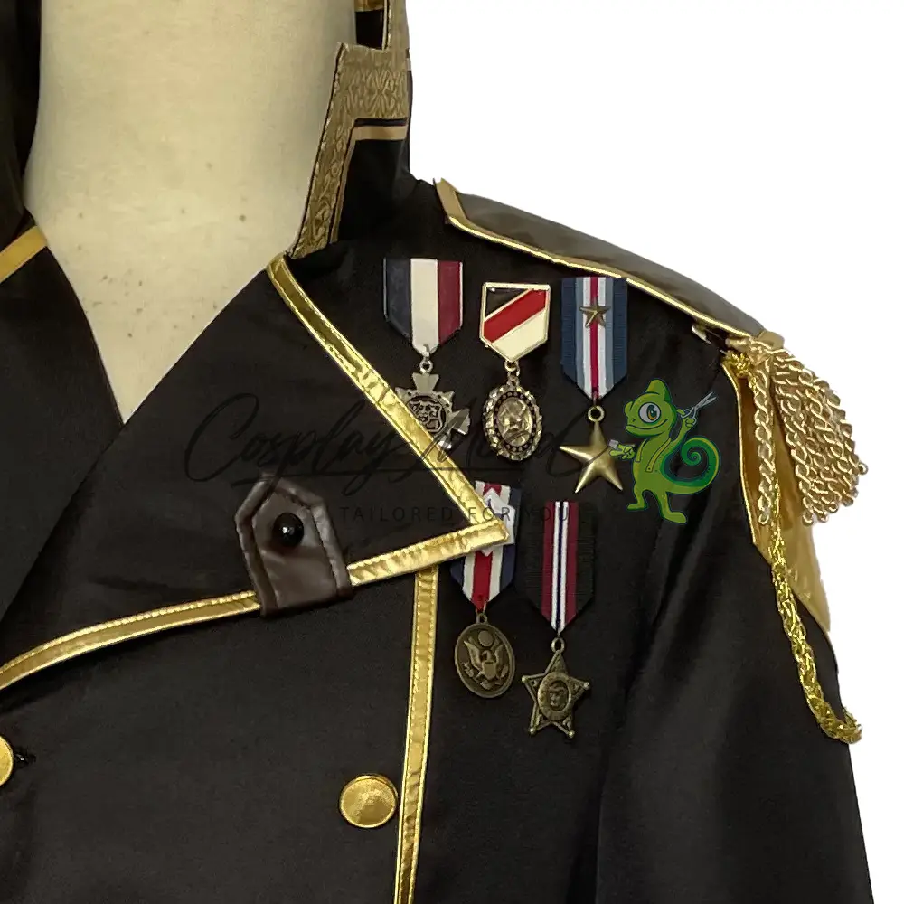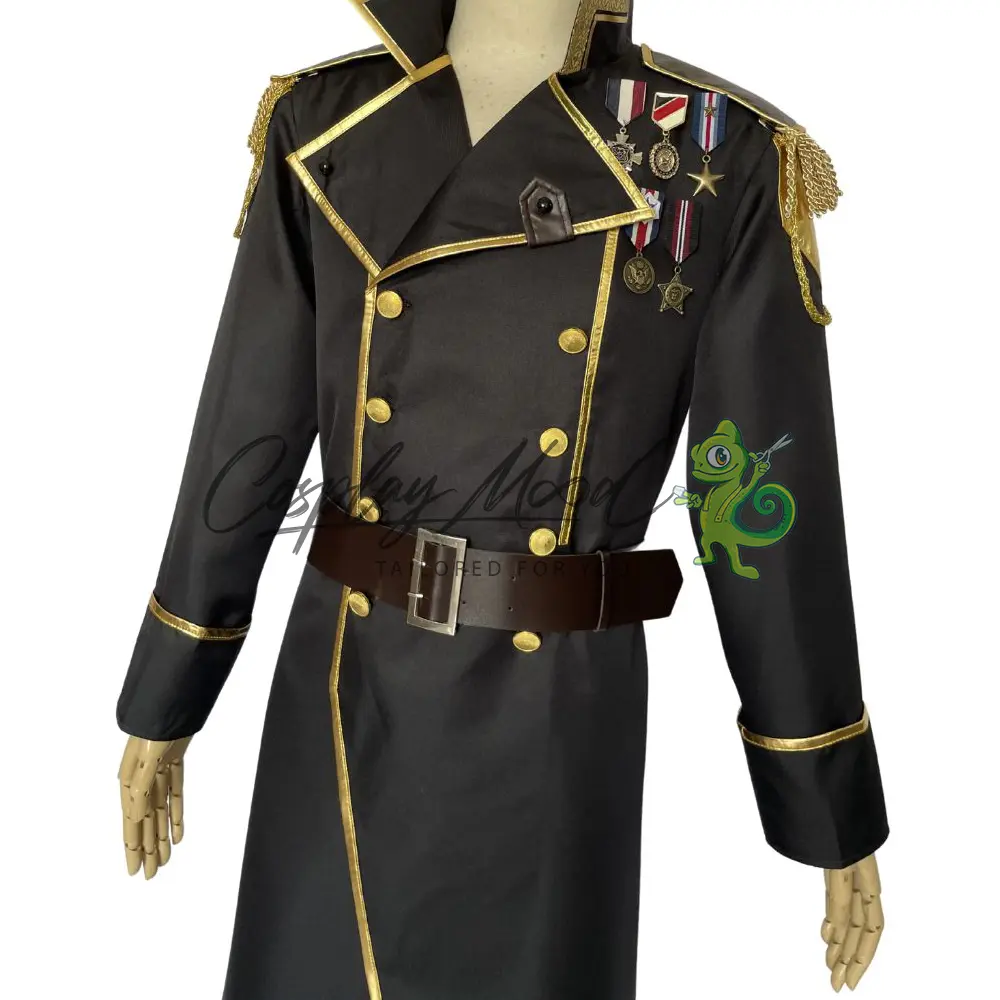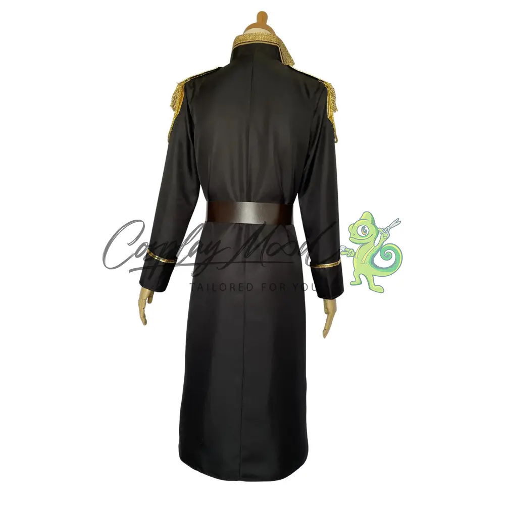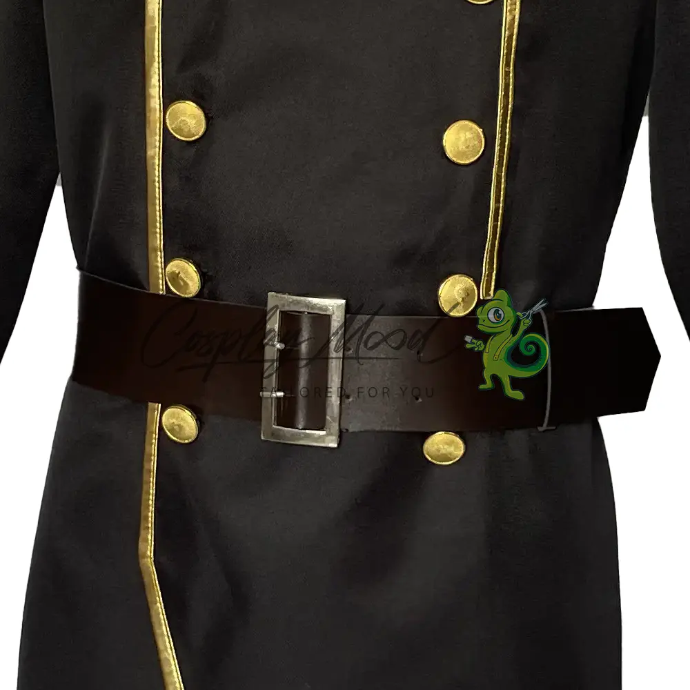 Giacca nera lunga con spalline, bordo dorato e medaglie applicate, cintura in eco pelle con fibbia in coordinato.