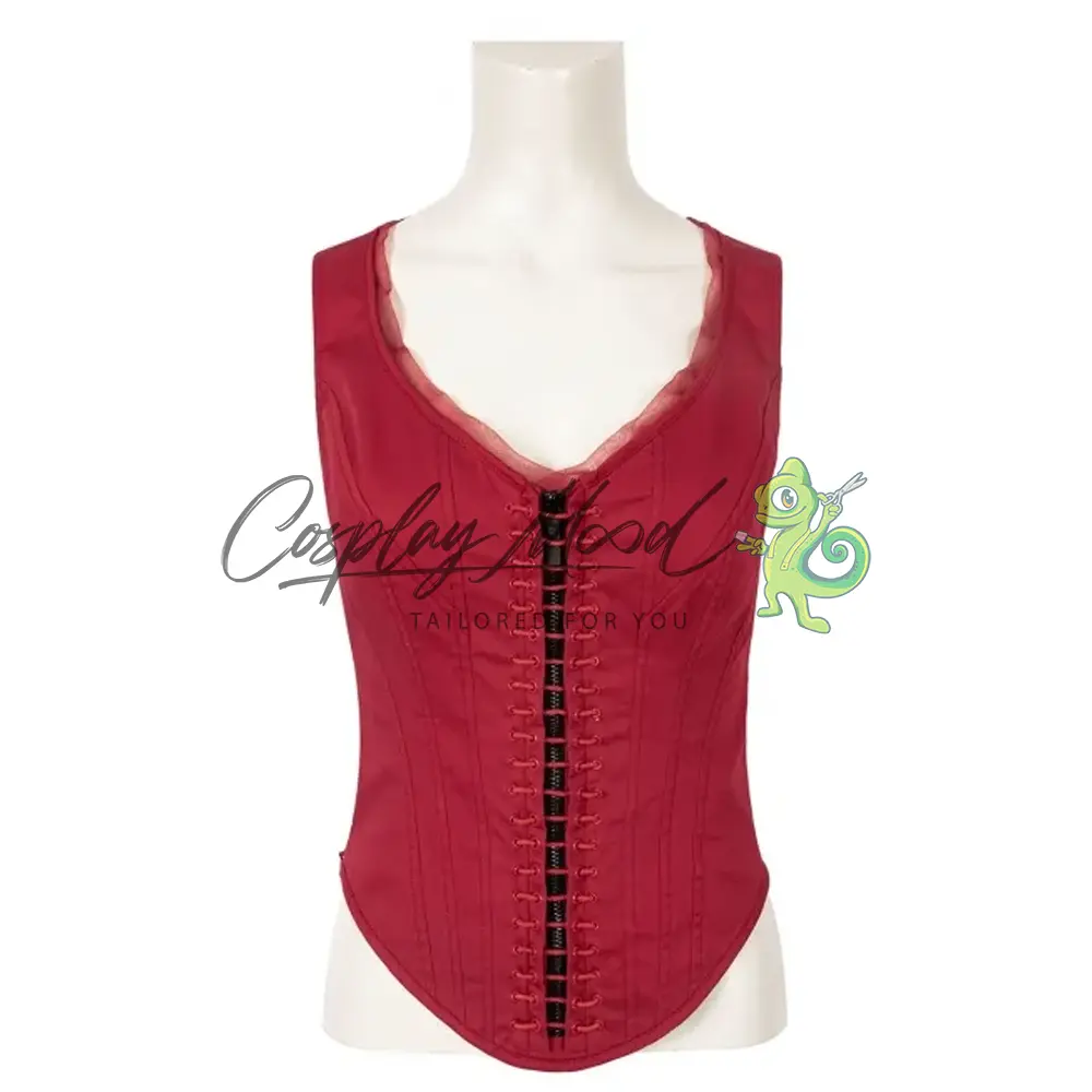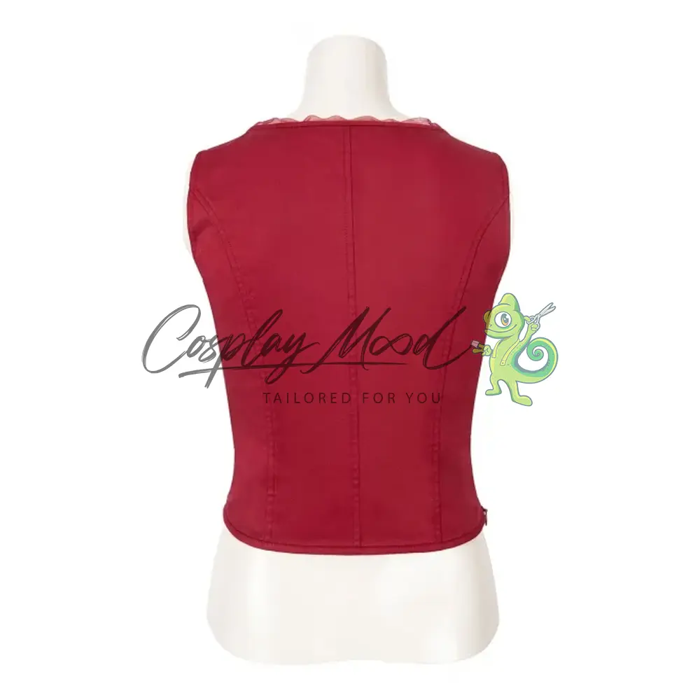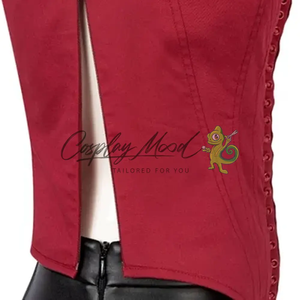 Top rosso con lacci, pantaloni lunghi neri in eco pelle, giacca lunga rossa, guanti senza dita ed anelli. Stivali abbinati acquistabili su richiesta.
