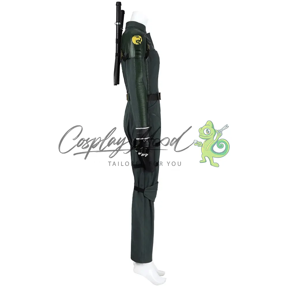 Tuta integrale verde scuro con cinghie e decorazioni, cintura con fibbia dorata, guanti neri a mezza dita e bracciali in eco pelle rigidi, fondina e ginocchiere. Scarpe incluse.