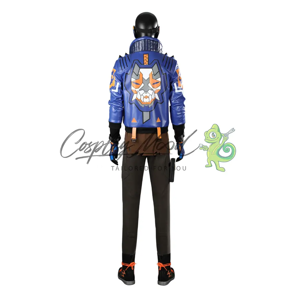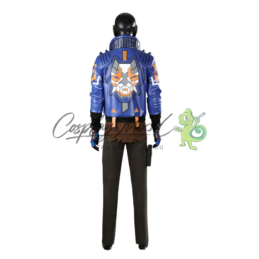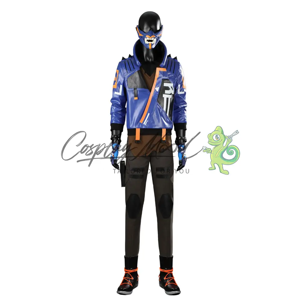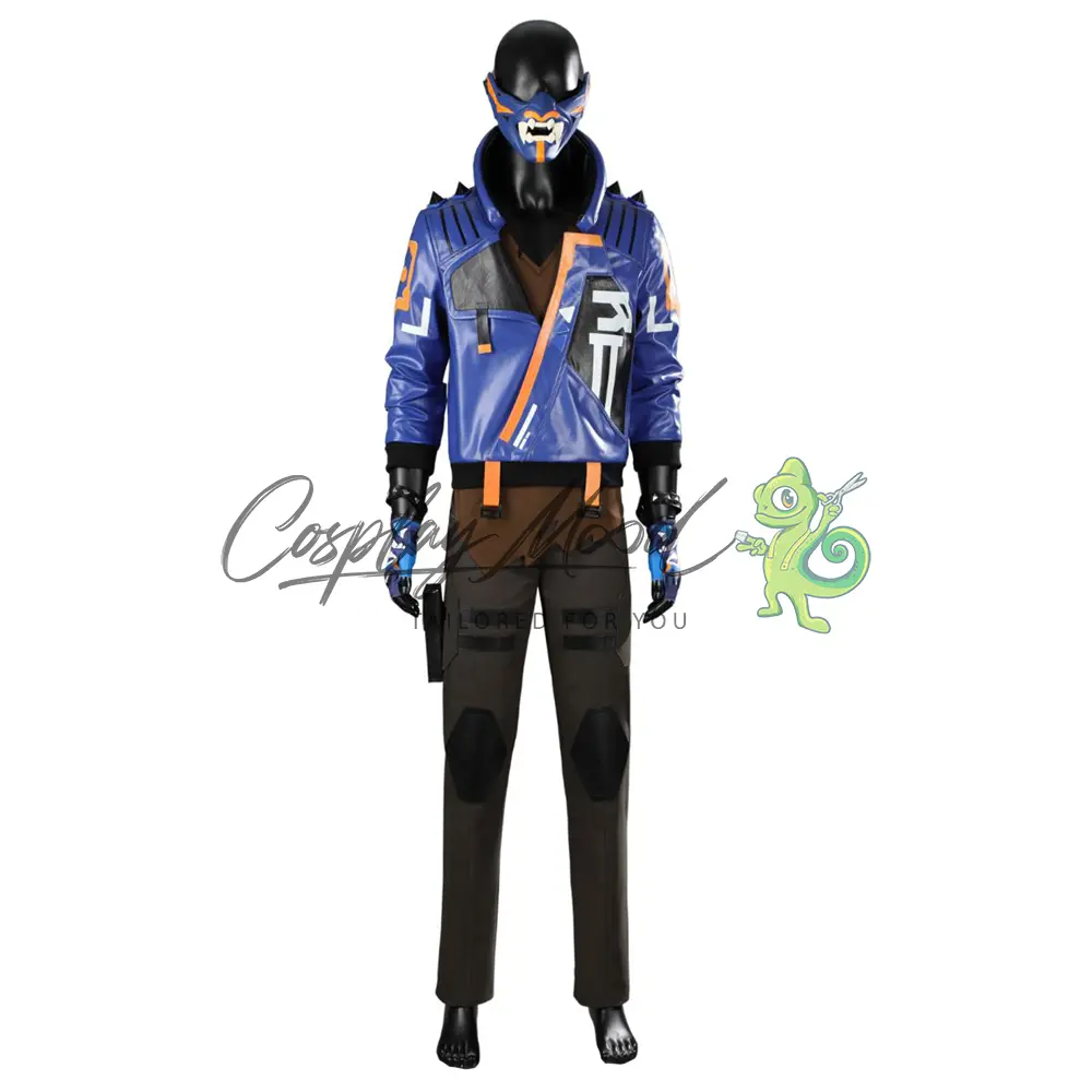 T-shirt marrone, giacca blu con texture in eco pelle, pendenti arancioni disegno sulla schiena e spuntoni sulle spalle, pantaloni marroni lunghi, maschera blu con zanne bianche in rilievo e finiture arancioni, guanti stampati, bracciali neri, borsello per la gamba. Calzature abbinate ordinabili su richiesta.
