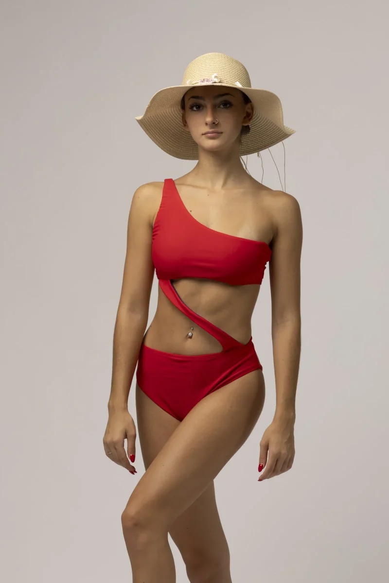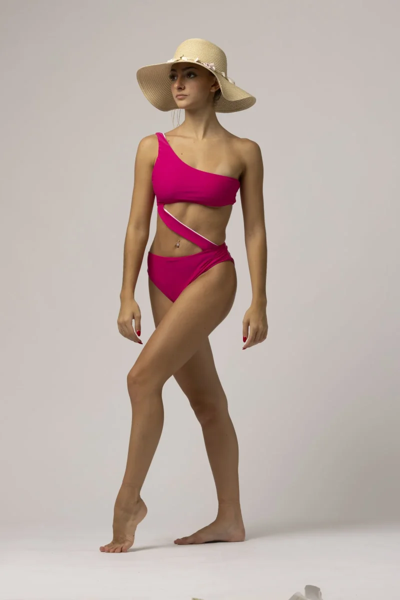 Costume mare a due pezzi collegati da una fascia doppiata e bicolore
