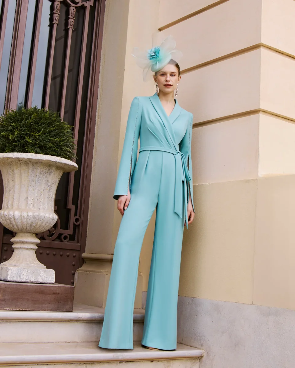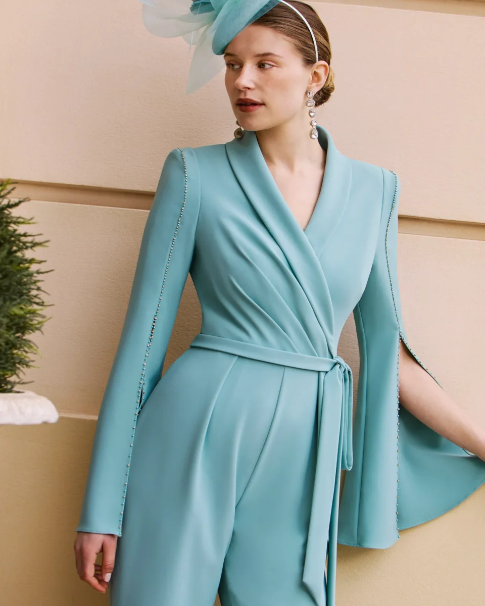 Realizzato in un tessuto fluido e strutturato, questo modello si distingue per la giacca con rever incrociato e cintura in vita, che sottolinea la figura con equilibrio e femminilità. Le maniche lunghe con apertura laterale aggiungono movimento e originalità al design, mantenendo un’eleganza discreta ma assolutamente d’effetto. Il pantalone palazzo completa il look con una linea slanciata e contemporanea.