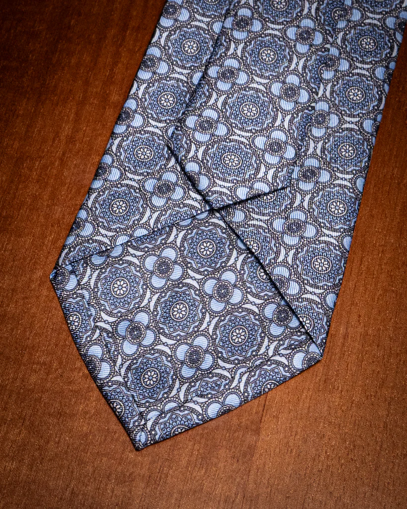In questo modello, la base Azzurro Ceruleo o Azzurro Polvere funge da tela per un’intricata composizione di petali stilizzati. La lavorazione jacquard crea un effetto mosaico: ogni elemento del fiore è definito da micro-armature differenti che ne esaltano i contorni, dando l’illusione che il disegno sia incastonato nella seta. Il pattern è regolare e denso, creando un ritmo visivo che alterna riflessi luminosi a zone più opache, conferendo alla cravatta una tridimensionalità materica eccezionale e una lucentezza dinamica.