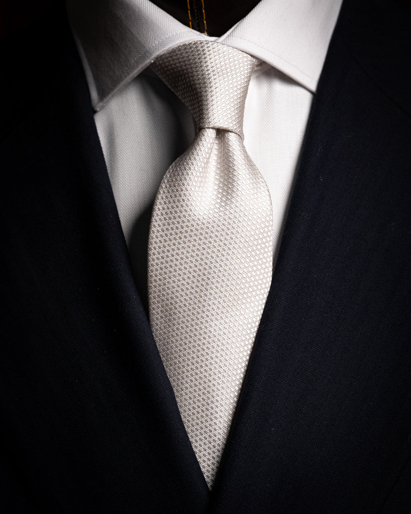 • Trama: Pattern geometrico-floreale a ripetizione. L’alta densità di punti jacquard assicura che il motivo mantenga la sua simmetria perfetta anche in prossimità del nodo.