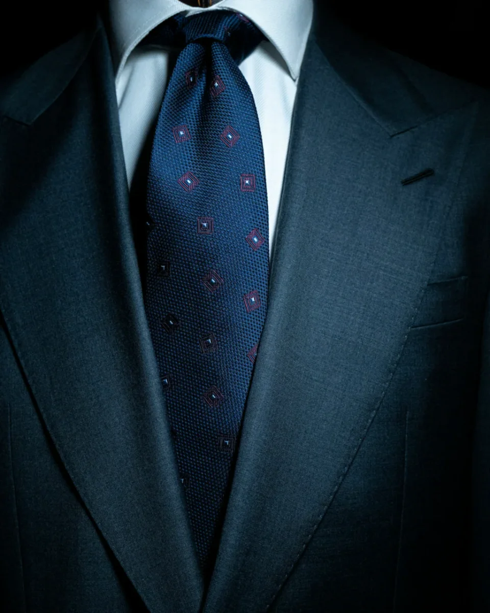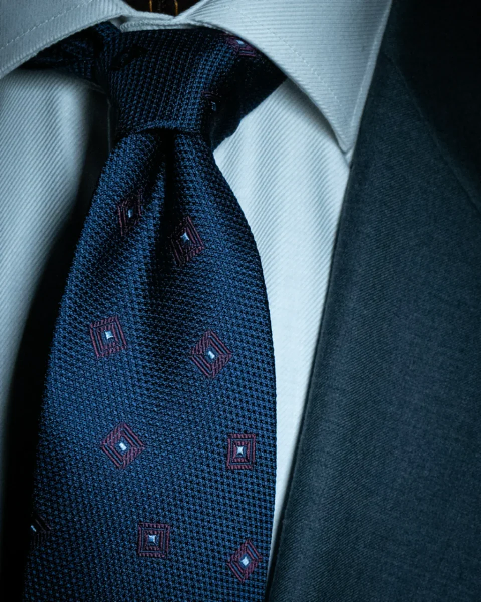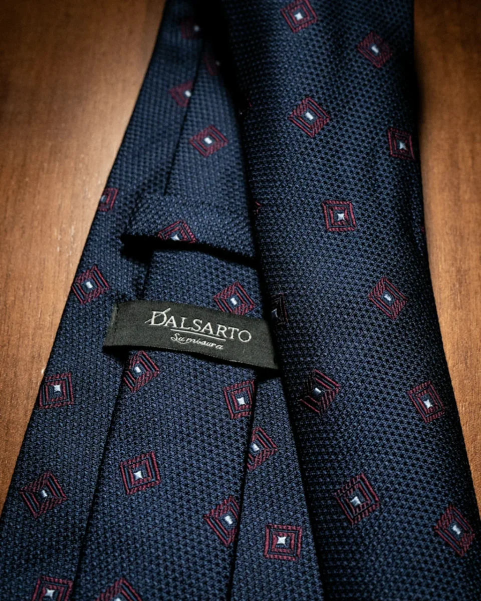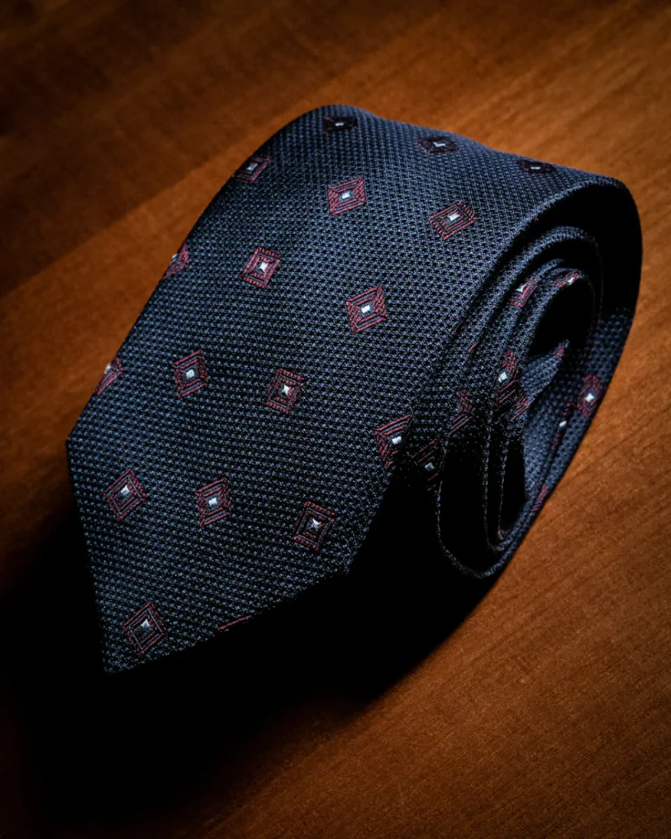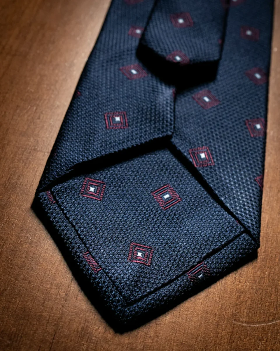 Questo modello poggia su una base Blu Navy profonda e compatta, che funge da tela per una geometria ordinata: una costellazione di rombi Bordeaux. Il bordeaux scelto non è piatto, ma una sfumatura di vino scuro che vira verso il marasca, capace di aggiungere calore senza rompere il rigore del completo. Grazie alla lavorazione jacquard, il rombo emerge dalla seta con una micro-armatura che lo rende leggermente a rilievo, donando alla cravatta una tridimensionalità architettonica che cattura lo sguardo con discrezione.