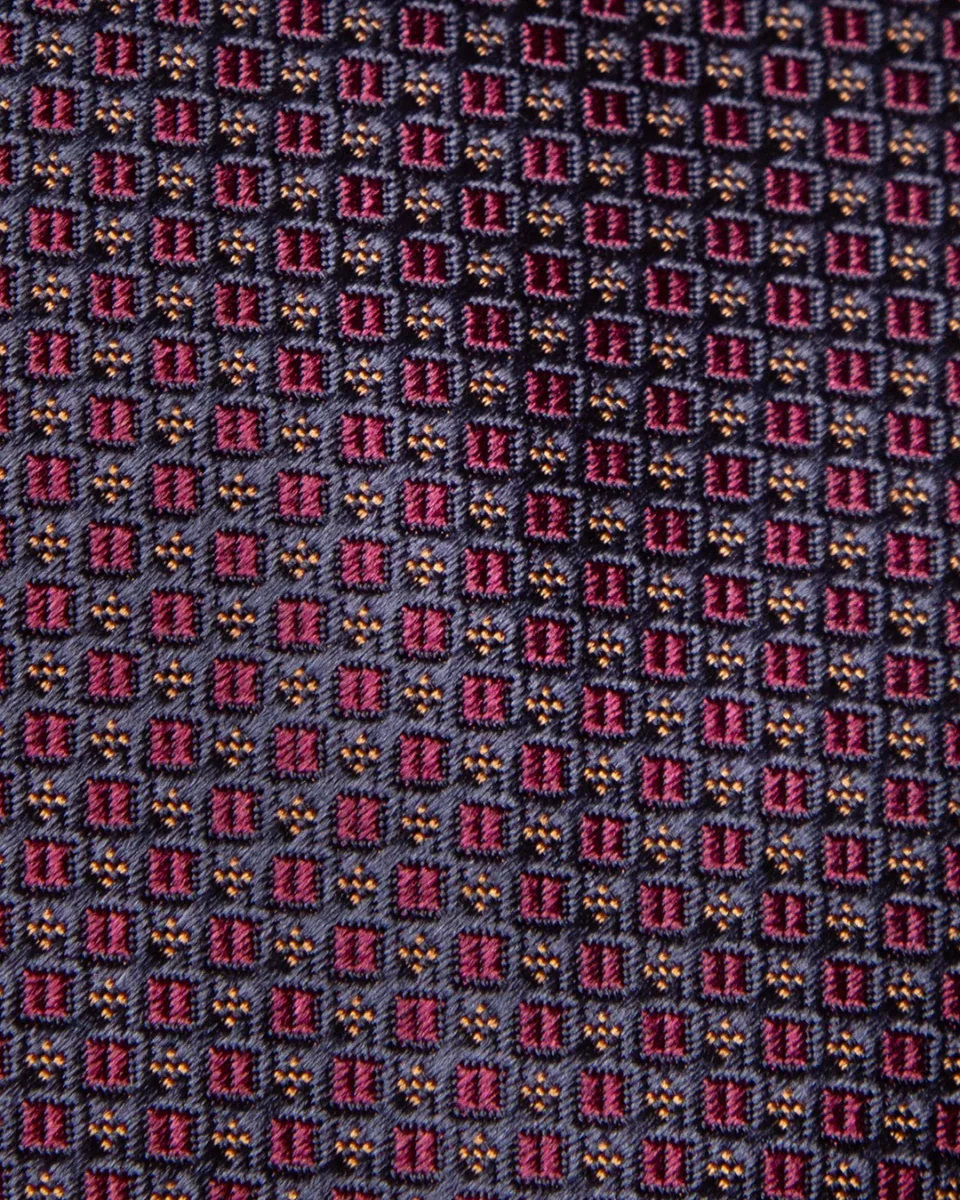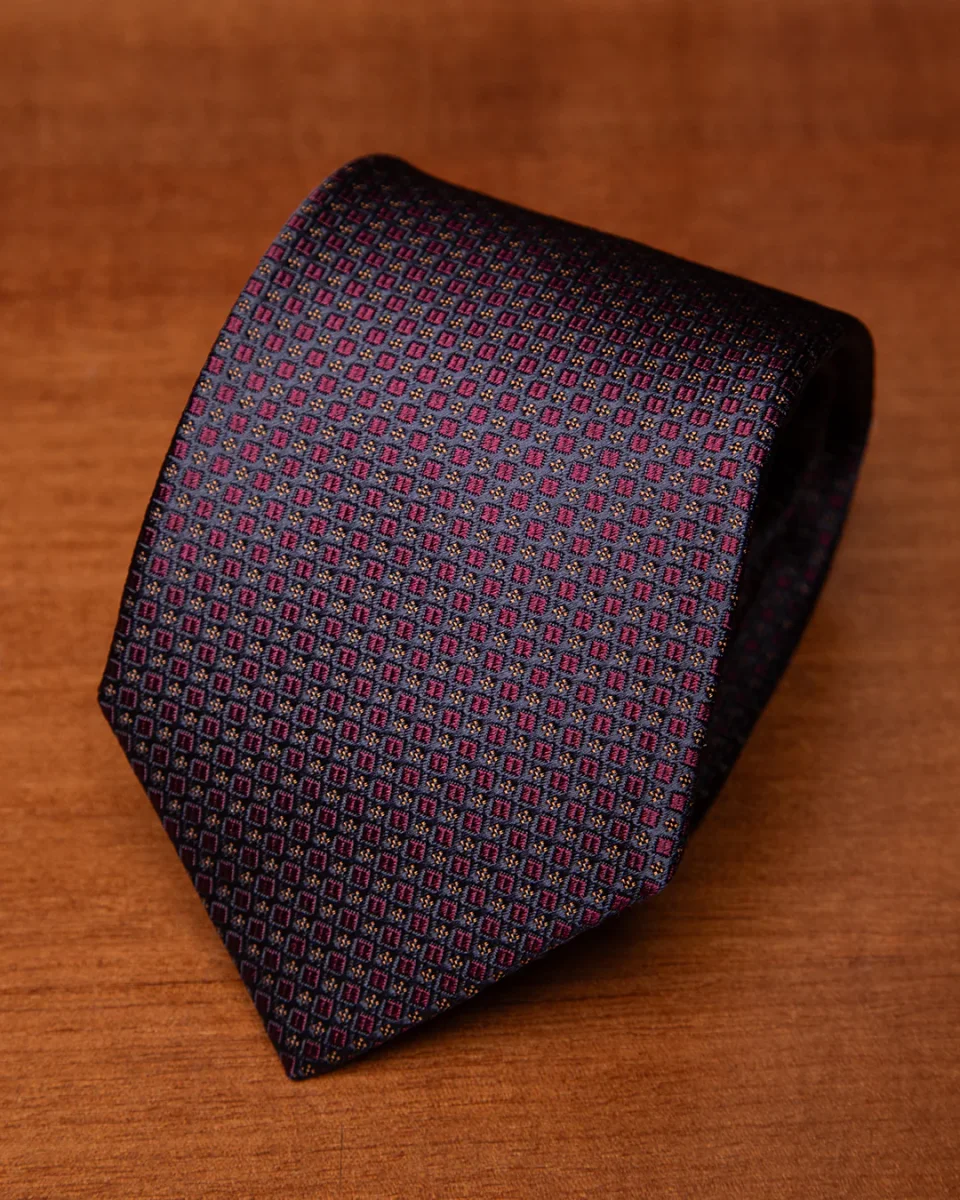 Questo modello si distingue per la sua base blu profonda, arricchita da una lavorazione jacquard che disegna piccoli quadratini in una sofisticata tonalità Prugna. L’accostamento tra il freddo del blu e il calore violaceo del prugna crea un effetto ottico di grande profondità, rendendo la cravatta vibrante e moderna senza perdere il suo rigore sartoriale.