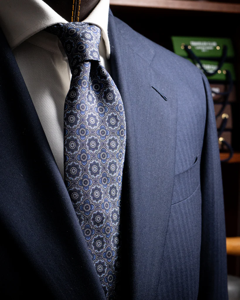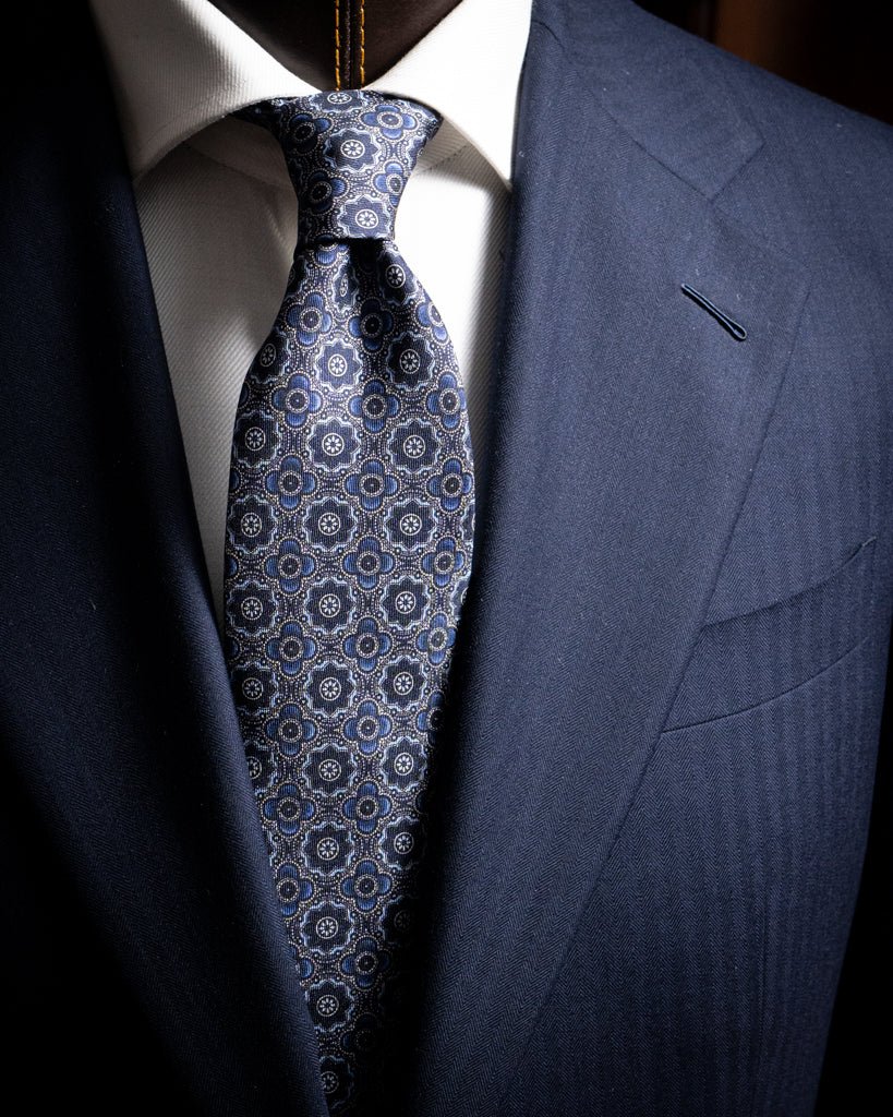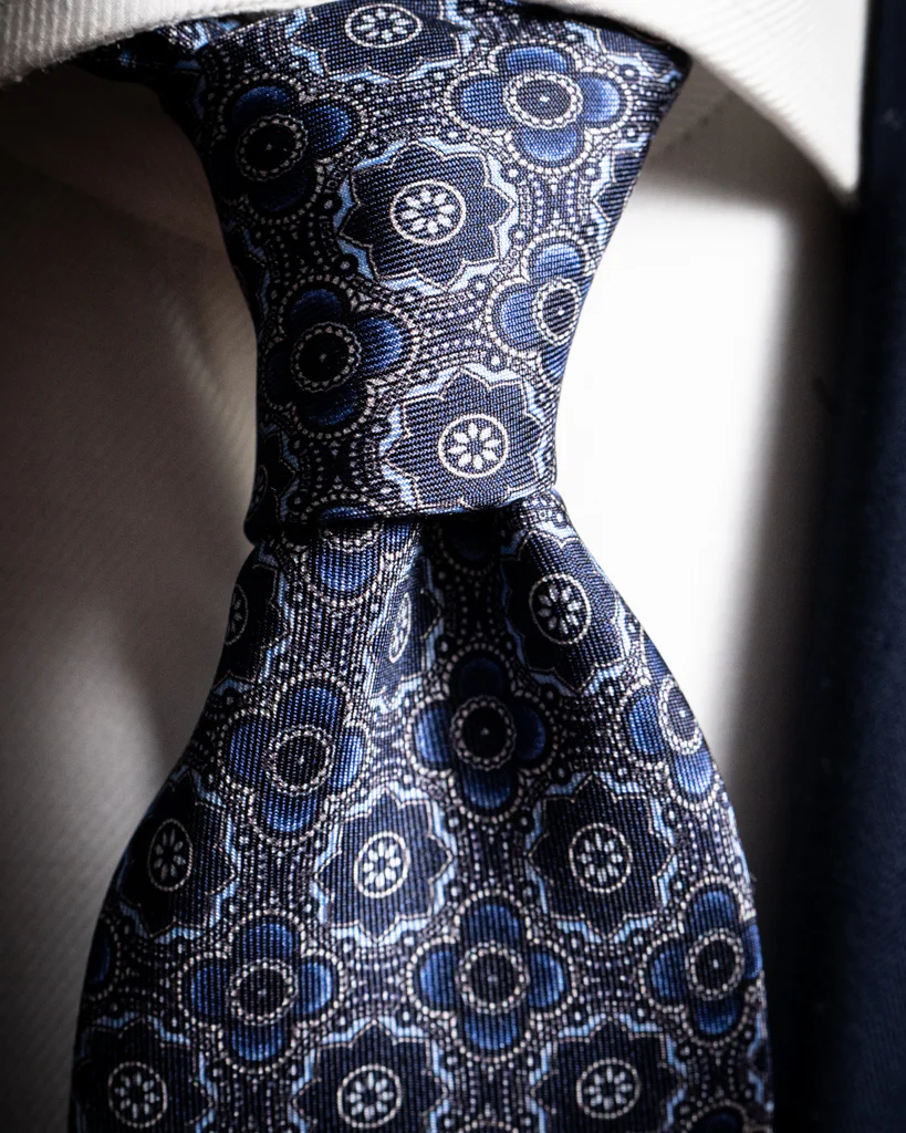In questo modello, la base Blu funge da griglia per un’intricata composizione di petali stilizzati. La lavorazione jacquard crea un effetto mosaico: ogni petalo è definito da un cambio di armatura che ne esalta il contorno, dando l’impressione che il disegno sia incastonato nella seta. Il pattern è regolare e denso, creando un ritmo visivo che alterna riflessi luminosi a zone d’ombra, donando alla cravatta una tridimensionalità materica eccezionale.