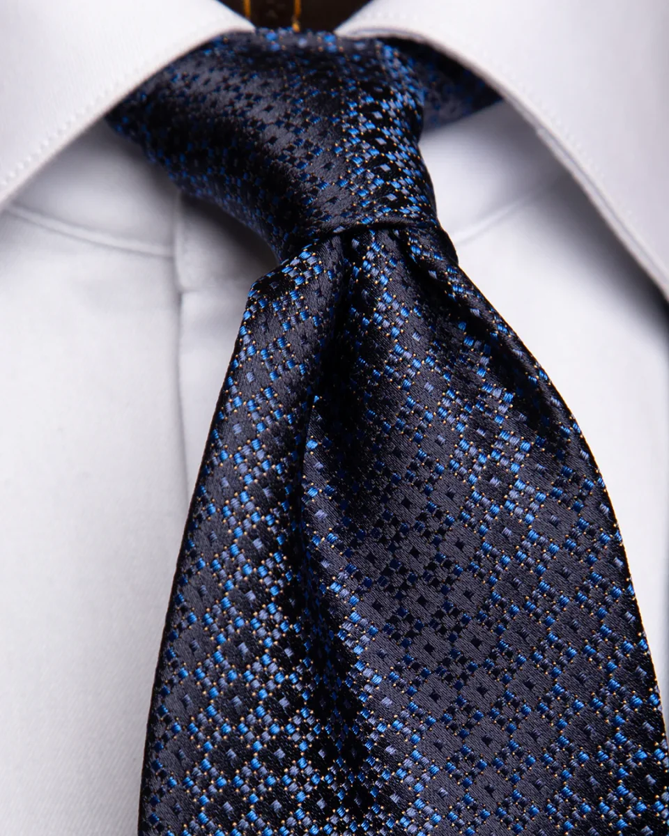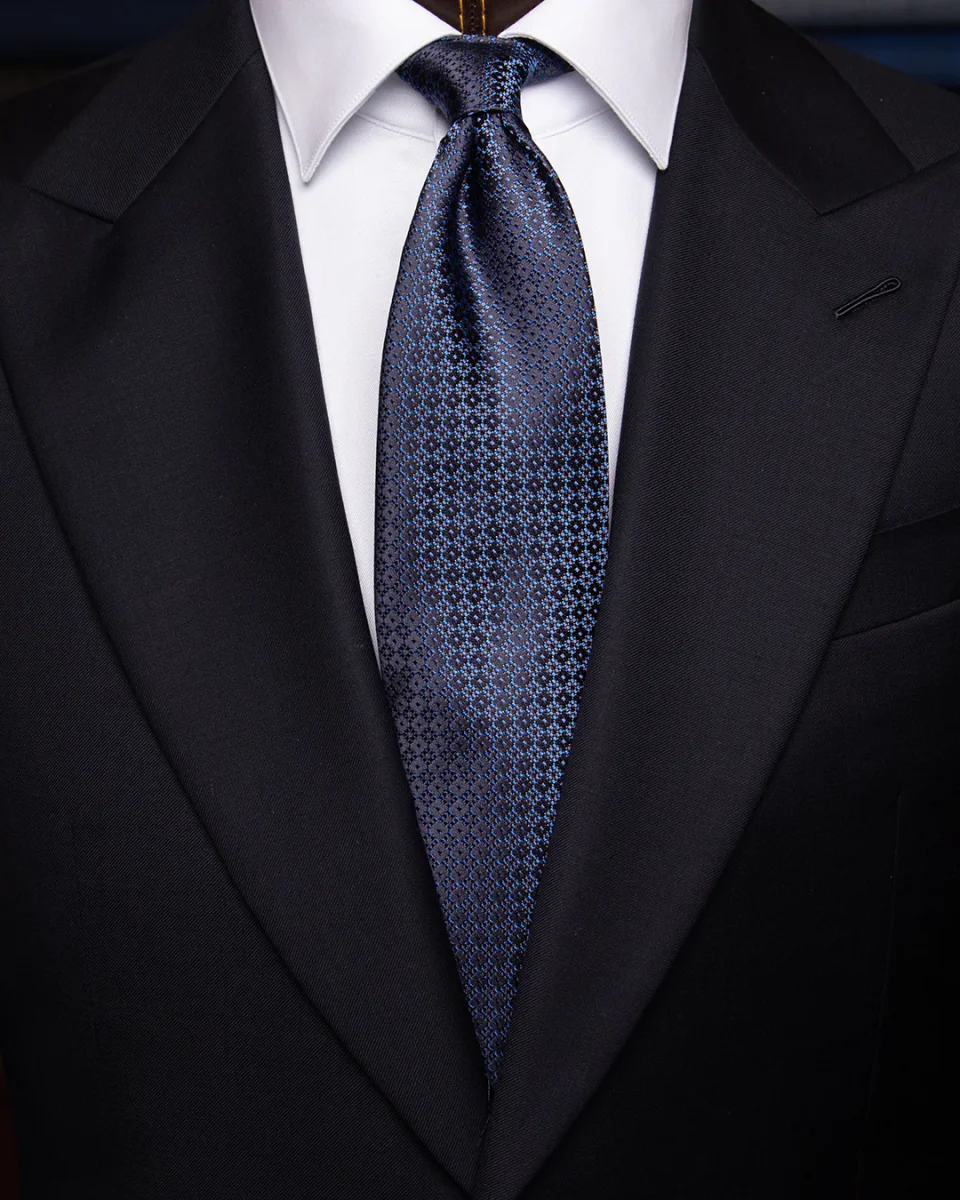 La Cravatta Blu con Rombi in Seta è un accessorio dal carattere deciso e classico, capace di unire l’autorità del blu alla precisione geometrica di un pattern tradizionale della sartoria internazionale.