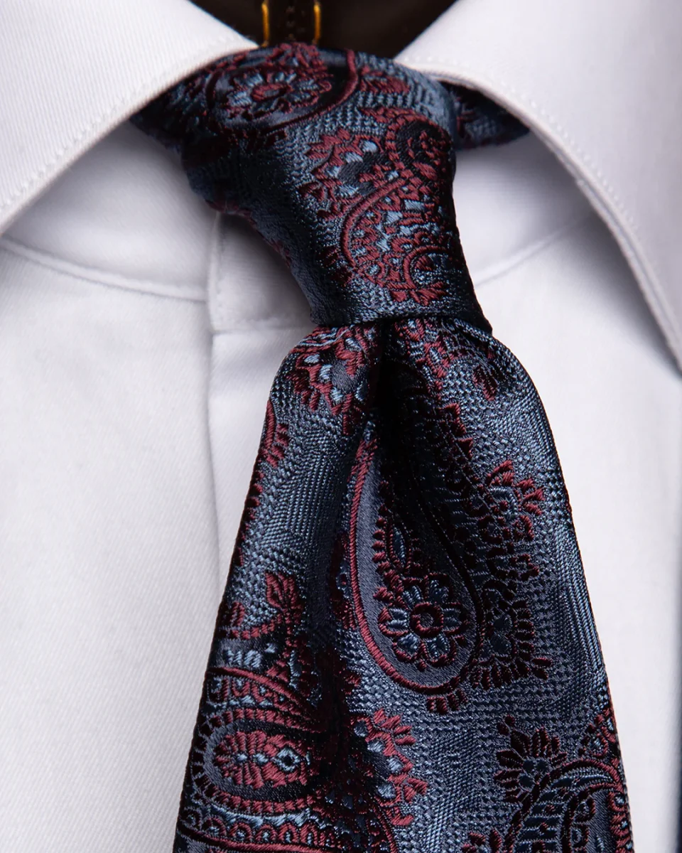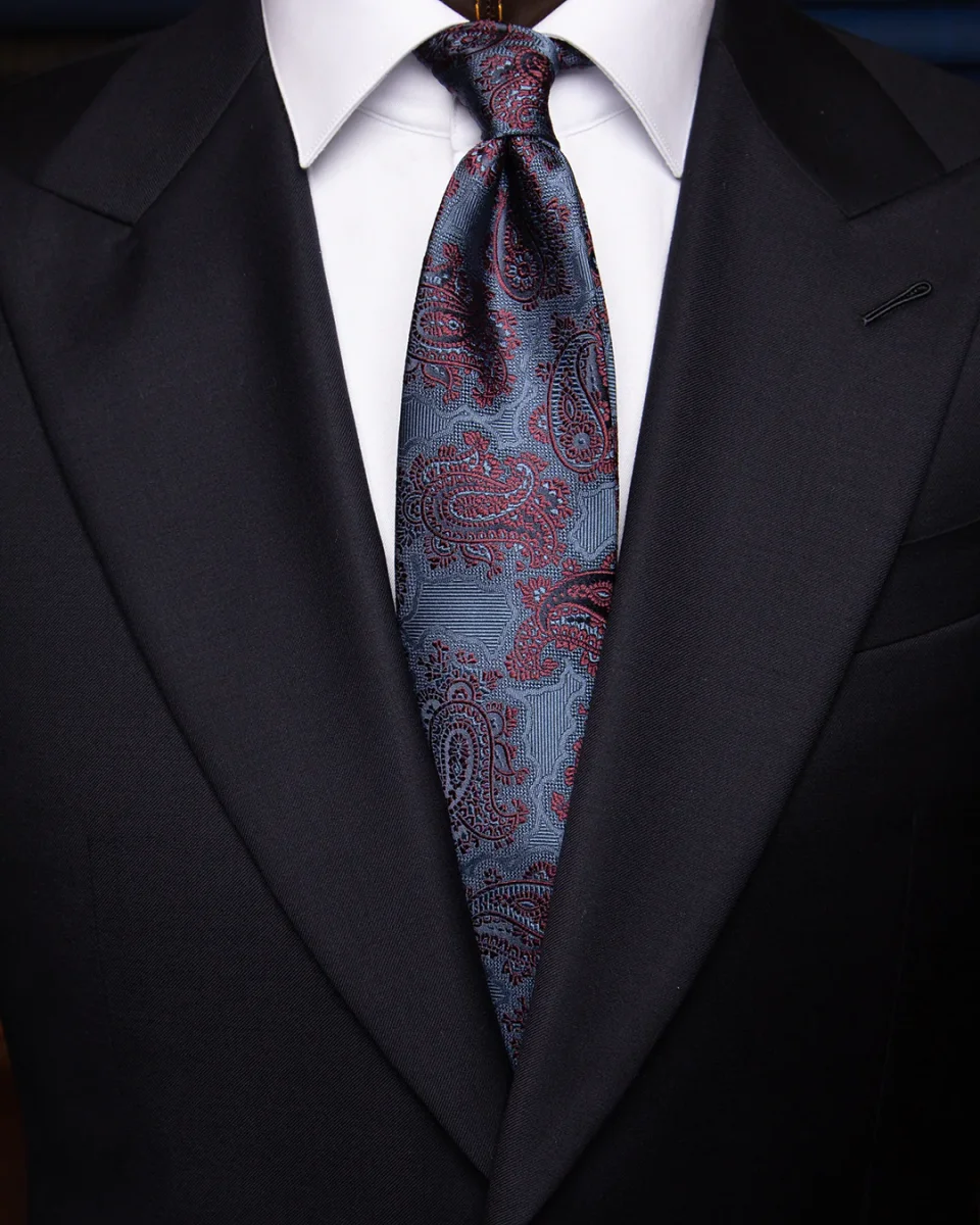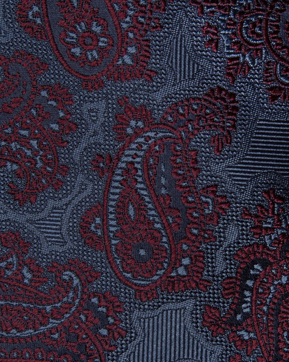 Questo modello rappresenta l’apice della lavorazione jacquard: la base blu non è una superficie liscia, ma presenta una tessitura damascata che crea un gioco di luci e ombre tono su tono. Su questo sfondo architettonico si staglia la fantasia Paisley rossa, le cui caratteristiche “gocce” apportano una nota di colore caldo e una sinuosità che rompe la rigidità dei look formali.