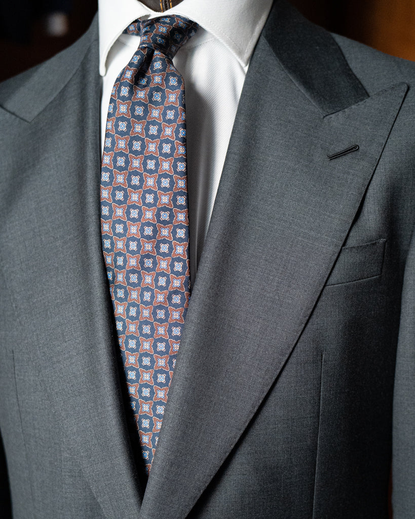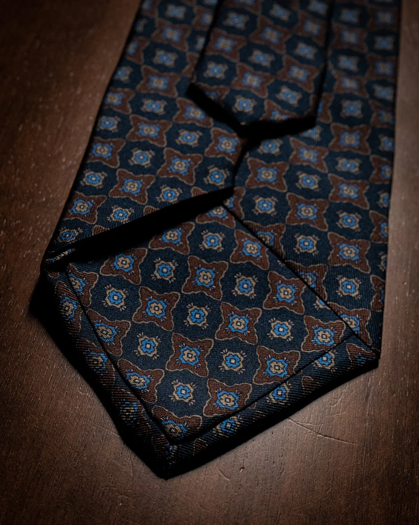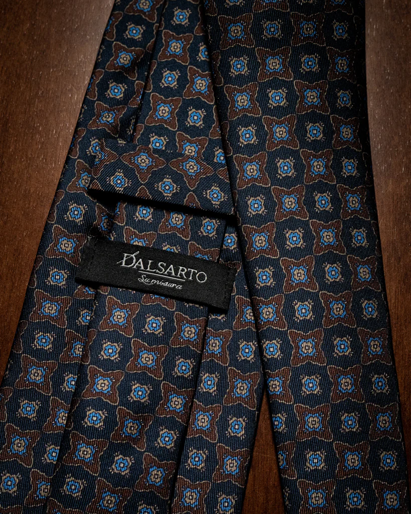 Questo modello gioca sull’intreccio di due colori sovrani: il Blu Navy e il Marrone Bruciato. La micro-fantasia — che può variare da un piccolo occhio di pernice a un micro-rombo geometrico — nasce dall’alternanza dei filati jacquard, creando una texture che a distanza appare come un unito mosso, ma che da vicino rivela un mosaico di sfumature. È una cravatta che non urla, ma sussurra classe, ideale per chi cerca un accessorio che si adatti con naturalezza sia alla luce naturale che a quella degli interni.