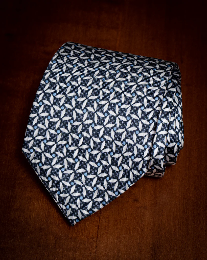 - Trama: Pattern a mosaico operato ad alta densità. La precisione millimetrica del telaio jacquard assicura che il motivo floreale rimanga perfettamente nitido e proporzionato, anche in prossimità del nodo.