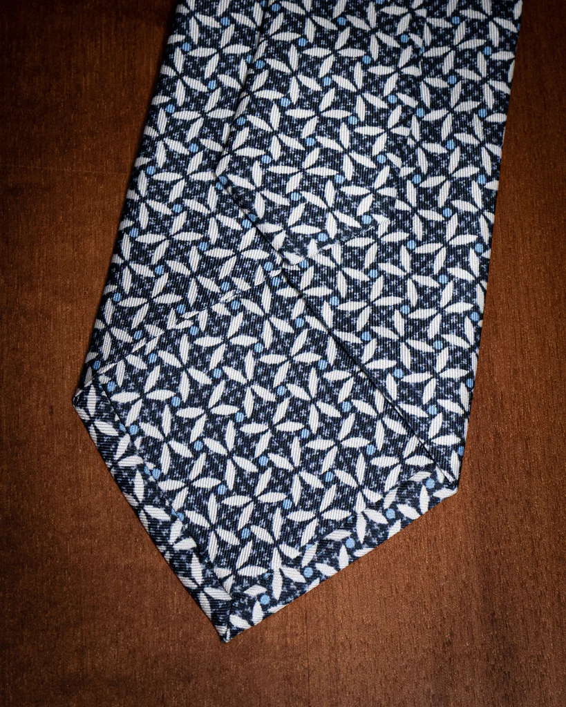 Questo modello si sviluppa su una base Blu Navy profonda, che funge da struttura portante per un intricato mosaico floreale declinato nei toni dell’Avio. La lavorazione jacquard trasforma il disegno in una superficie tridimensionale: ogni petalo e ogni tessera del mosaico sono definiti da micro-armature che riflettono la luce in modo differenziato. L’effetto visivo è quello di una seta “scolpita”, dove il blu scuro del fondo esalta la luminosità serena e leggermente grigiastra dell’avio.