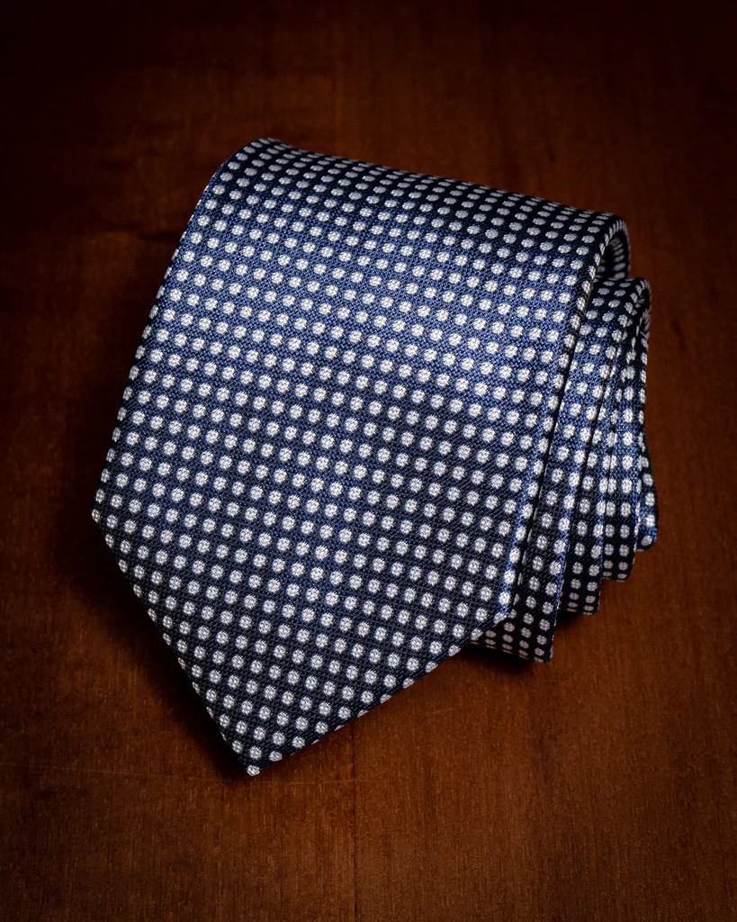 Questo modello si basa su una tonalità Blu Notte profonda e densa, quasi scura come l’inchiostro, che emana un’aura di autorità calma e mistero. La fantasia a Pois è realizzata attraverso una lavorazione jacquard ad altissima precisione. Ogni cerchio è una micro-scultura tessile: il filato a contrasto è intrecciato con un’armatura satinata che lo rende lucente e leggermente a rilievo rispetto alla base opaca del blu, creando un ritmo visivo di rara pulizia formale.
