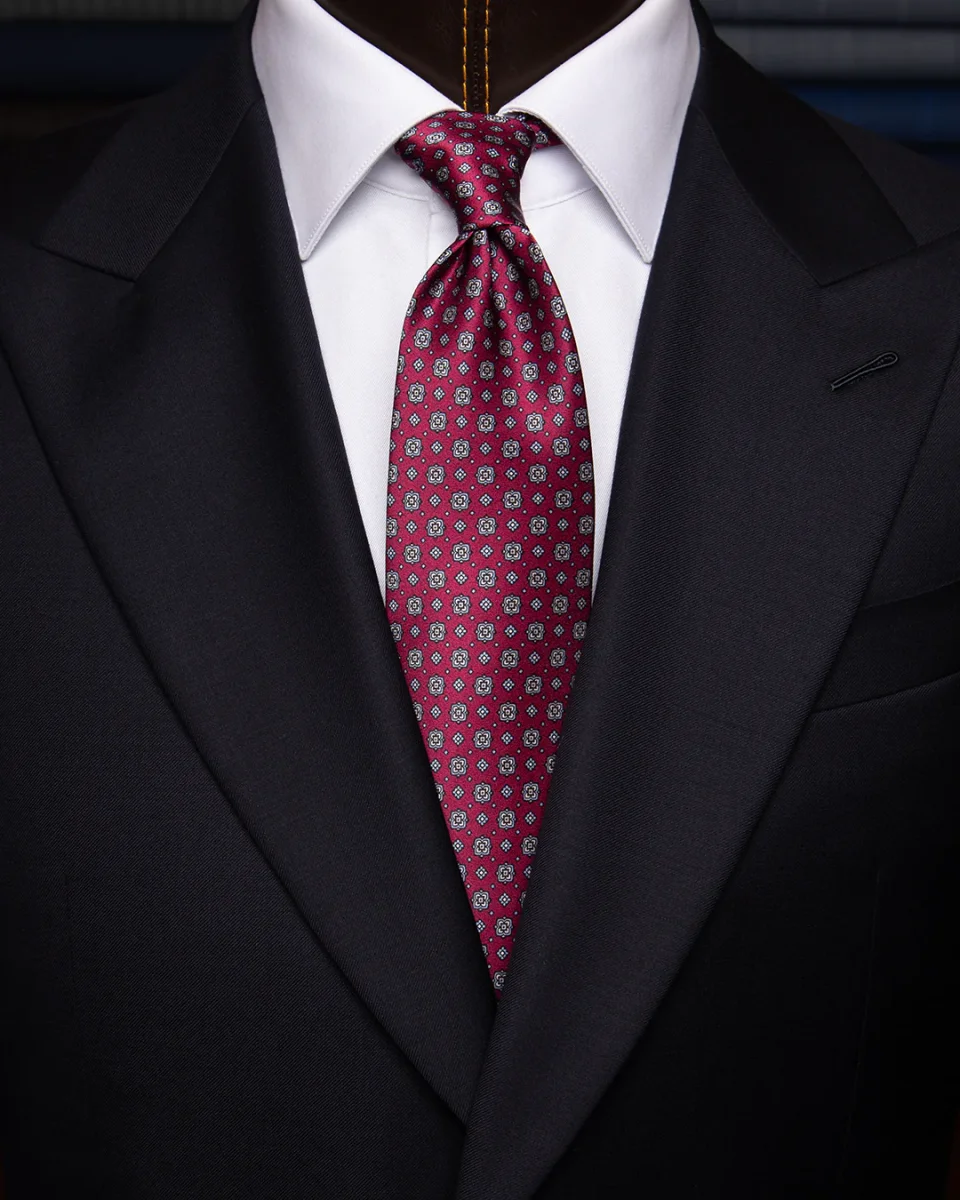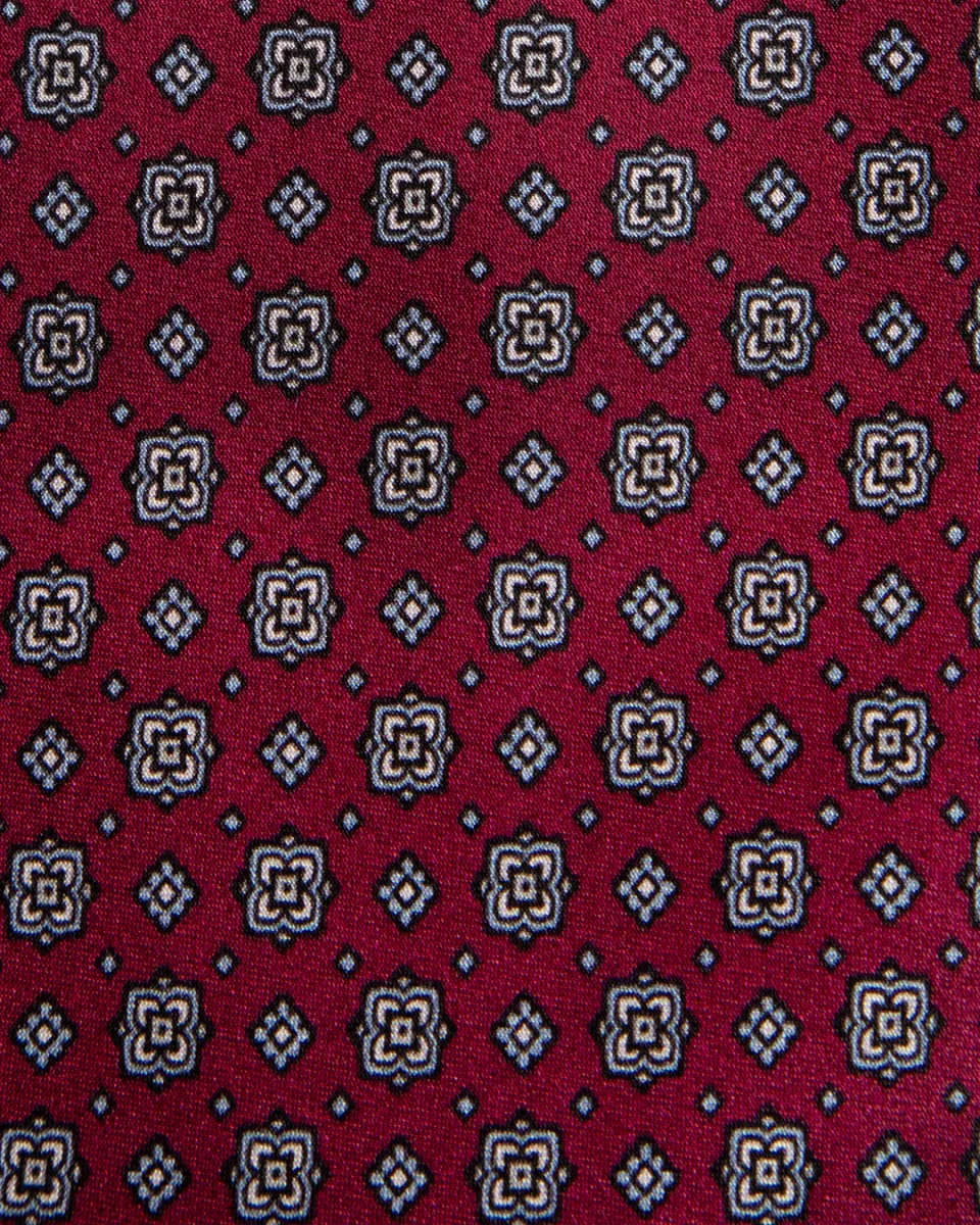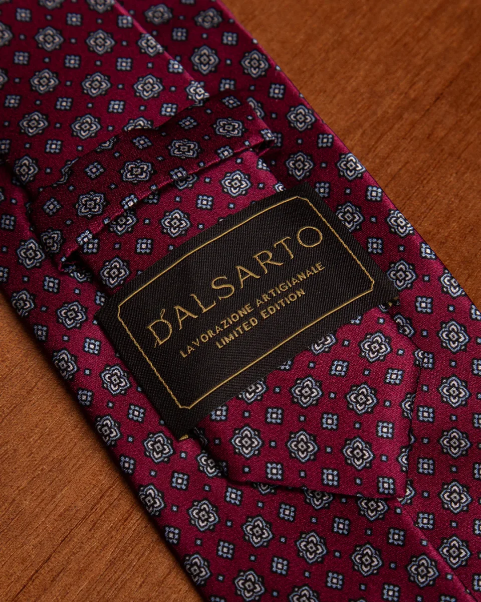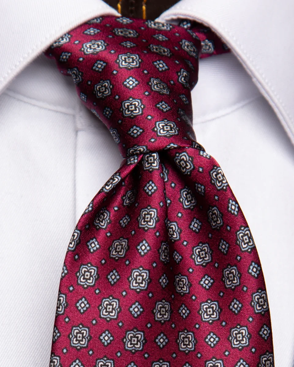 In questo modello, l’espressività dei motivi floreali viene mitigata dall’uso del grigio, creando un pattern figurativo che risulta elegante e mai eccessivo. La base bordeaux conferisce calore e autorità, rendendo questa cravatta la scelta ideale per chi vuole osare con un disegno floreale mantenendo un profilo professionale e curato.