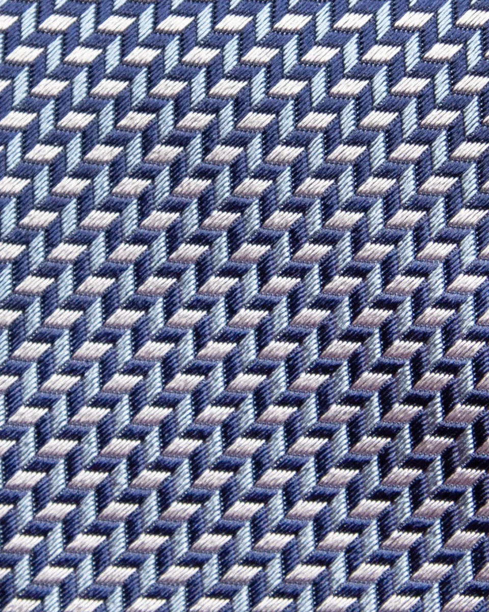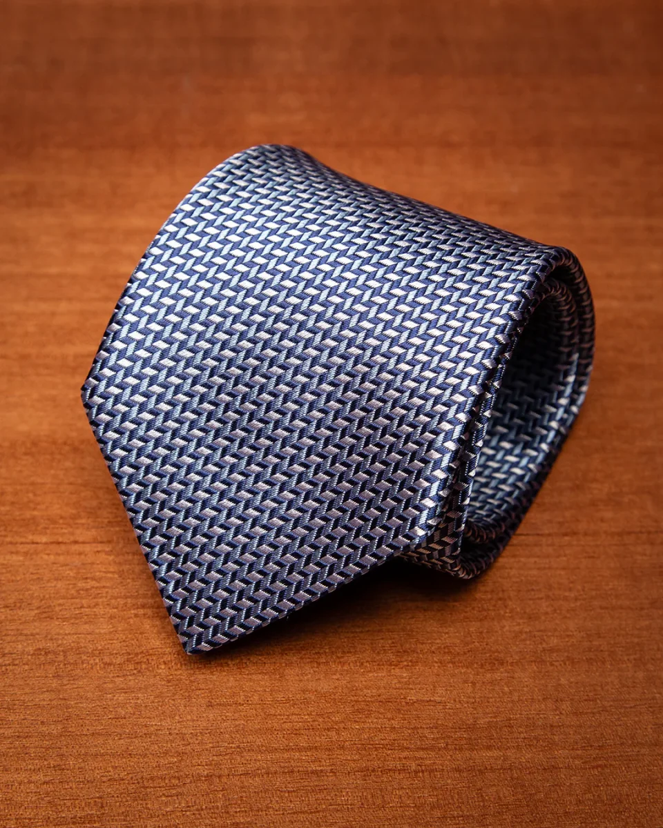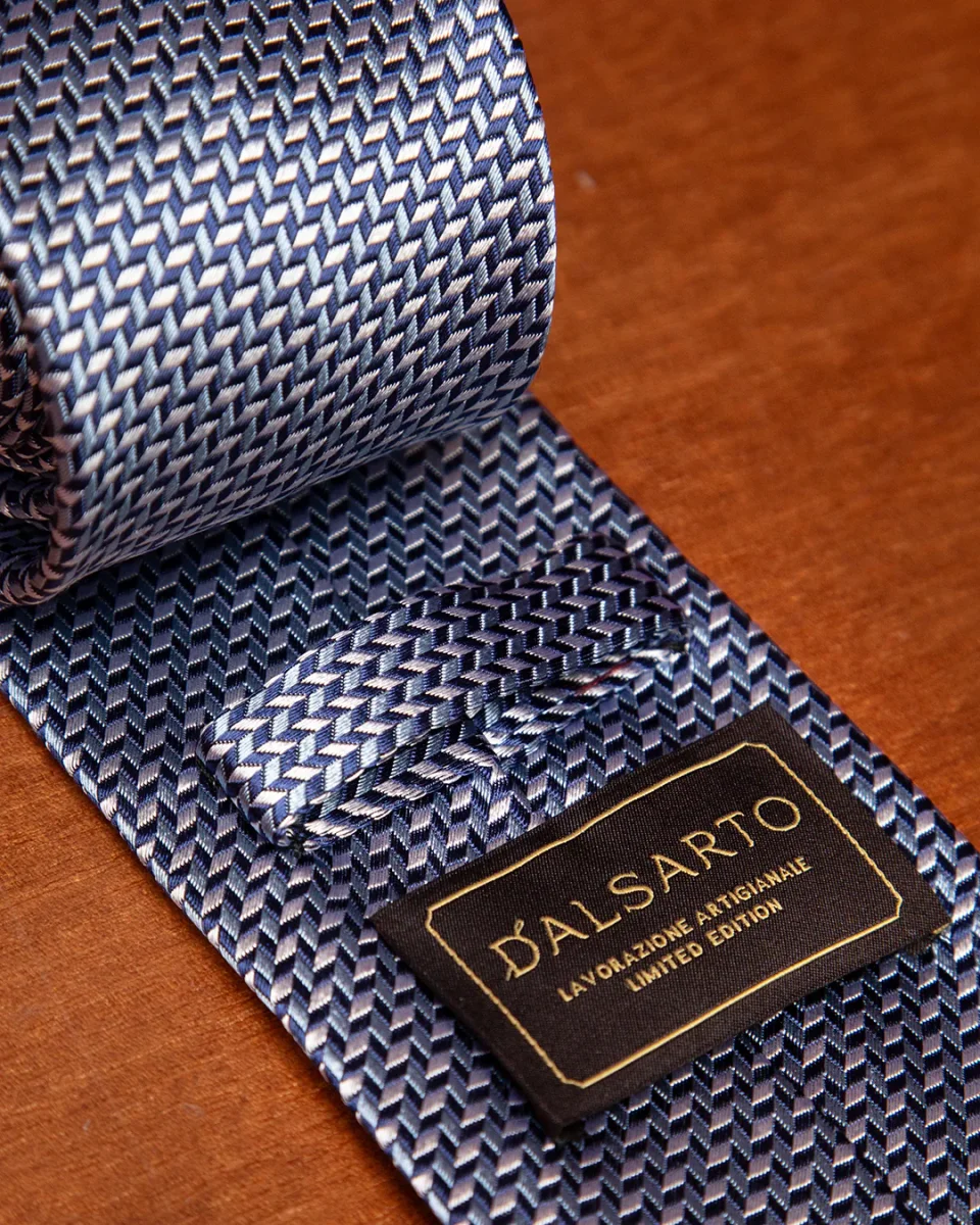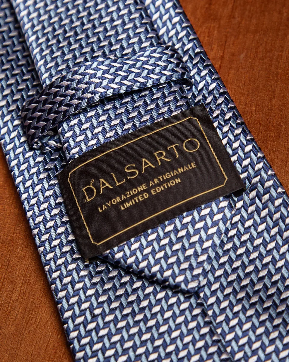 Questo modello gioca sulla combinazione di tre gradazioni di blu e bianco, intrecciate in una fantasia che può spaziare da un motivo geometrico regolare a un micro-disegno floreale o astratto. L’uso del bianco come colore di contrasto non solo definisce la fantasia, ma conferisce all’accessorio una nota di pulizia e brillantezza che cattura lo sguardo con discrezione.